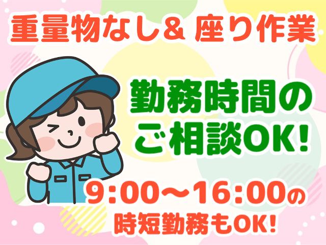 勤務時間の相談OK!小物製品の目視検査/女性活躍中 土日祝休み/座り作業/車通勤OK/日払い制度有