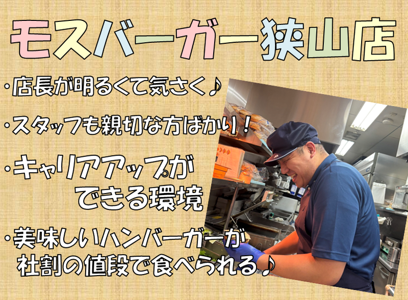 仕事内容 / 4月入社OK‼入社時期は面接時で応相談 \ 入社してから試用期間突破後、半年で副店長。 もう半年後に店長に昇格した方もいます♪ ✅未経験からでも最短1年で店長に! ✅月給26万円~35万円 +賞与年2回+昇給あり! ✅残業少なめ!食事補助あり! 引っ越しを伴う移動なし! \⭐全国的に人気のモスバーガーで キャリアアップしませんか?⭐/ 更なる店舗の強化の為に 新しいスタッフを大募集(・v・)ノ キャリアアップが叶う環境で 店長候補として働いてみませんか?? 店長→エリアマネージャー→部長など 将来は責任のある安定したポジションを 目指すことができます♪ ✧*˖✧⋆˖*✧⋆˖✧⋆˖✧⋆˖✧*˖✧⋆˖*✧⋆˖✧ 【仕事内容】 ■カウンター接客・レジ対応 ■ハンバーガーや サイドメニューの調理 ■スタッフ育成、シフト管理 店長候補として) ✧*˖✧⋆˖*✧⋆˖✧⋆˖✧⋆˖✧*˖✧⋆˖*✧⋆˖✧ ⭐ポイント⭐ ●調理に関して難しい工程はありません! 調理未経験でも簡単に覚えられます。 先輩スタッフもフォローします。 ●店内業務を一通り覚えて 慣れてきたら「シフト管理」 「スタッフ育成」「商品発注」など マネジメント業務にも チャレンジできます! ●配属店舗の希望も考慮 また、引っ越しを伴うような 転勤はございません。 ★当社運営の モスバーガーフランチャイズ店★ ・志木駅東口店 ・新座野火止店 ・カインズ朝霞店 ・武蔵藤沢店 ・ベスタ狭山店 【勤務地はベスタ狭山店です!】 いずれも車通勤・バイク通勤OK あなたが長く・安定して働ける 環境をご用意いたします♪ ✧*˖✧⋆˖*✧⋆˖✧⋆˖✧⋆˖✧*˖✧⋆˖*✧⋆˖✧ ☕「ベスタ狭山店」店長紹介☕ 店長の軽部です! アルバイトから経験して入社17年。 一時的には学校を卒業後、 一般企業に就職しましたが すぐに出戻りをしました(笑) あまりにもこの職場が好きで 仕事も好きだったからです♪ 周りのスタッフは皆仲が良く、 学生・主婦さん限らず たくさんの方たちが活躍されています! 応募お待ちしております♪ ✧*˖✧⋆˖*✧⋆˖✧⋆˖✧⋆˖✧*˖✧⋆˖*✧⋆˖✧ こんなモスバーガーが大好きな 軽部店長と親切な先輩スタッフの元で 将来の店長候補として一緒に働きませんか⁉ ✦・┈┈┈┈┈ ・✦✦・┈┈┈┈┈ ・✦ 株式会社木馬を知りたい方は 下記ホームページからご覧ください♪ ▼ https://www.mokuba-mos.com/ ✦・┈┈┈┈┈ ・✦✦・┈┈┈┈┈ ・✦