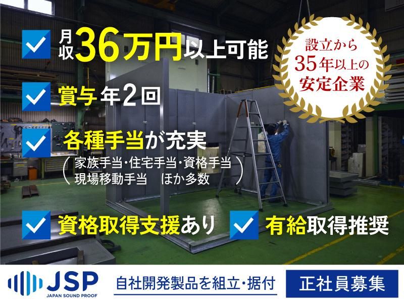 仕事内容 こんな働き方、そろそろ終わりにしませんか。 ・日給制で急な病気、怪我の際に収入が不安 ・天候次第で収入が変動 ・社会保険なしでは将来が不安 ・移動時間はサービス残業 同じ重量物を扱う仕事でも、 ココには守られる正社員という選択があります。 そして、経験を“任される側”に変えていく環境があります。 社会保険完備。 有給取得可能。 移動時間も手当支給。 賞与は実力評価制。 ■ 仕事内容 自社製品(防音設備)の組立・施工を行います。 工場内作業およびお客様先での現地施工があります。 屋内作業も多く、天候に左右されません。 重量物の搬入・組立・解体はクレーンを使用。 ボルトジョイント中心の構造で、現場経験者であれば早期に慣れていただけます。 作業はチーム制。 現場を一人で抱え込むことはありません。 チームで支え合う体制です。 困りごとはすぐに相談できる距離感です。 ■ 現場レベルについて 物件は難易度に応じて レベル1〜3に分かれています。 入社後はレベル1から担当し、 2~3年以内にレベル2物件を任せられる人材へ育成します。 任せられると判断した時点で、主担当として立っていただきます。 レベル3物件にはサブリーダーとして同行し、 段階的に経験を積んでいきます。 いきなり全責任を任せることはありません。 ■ 即戦力として活かせる経験 ・重量物搬入 ・とび職 ・土木工事 ・設備施工 ・建設現場経験 業種が違っても構いません。 段取り力・安全意識・現場対応力をそのまま評価します。 賞与は3ヶ月を基準に実力で増減。 経験は収入に直結します。 技術を磨けば海外SV派遣の道もあります。 ■ 成長と評価 必要な資格はすべて会社負担。 講習・テキスト・試験代まで全額支給。 年功序列なし。 仕事の成果を賞与に反映 現地移動時間も残業代として支給。 移動時間を含め労働時間はすべて残業代として支給