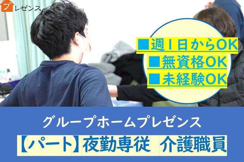 【仕事内容】 グループホーム(3ユニット)の夜勤専従スタッフ募集! 週1日からOK!たくさん働きたいのご希望も大歓迎です!WワークもOK!未経験の方も歓迎です! 株式会社PRESENCEは、横浜市発の「みんなにやさいしい介護のプロを目指す」プロジェクト2018、2019年に受賞された認定事業所です。 【具体的な仕事内容】 夜勤は3~4名体制!インカムを装着し当日の夜勤者と連絡を取りながら勤務出来るので緊急時などスムーズに対応できます。 また、見守りシステムが入ってる為、巡視の回数は少なめです。 ・身体介護(見守り、移動介助) ・排泄介助 ・食事(配膳、下膳、見守り、食事介助) ・夜間帯のご利用者様の見守り ・業務記録 ・起床時の介助 など ※無資格・未経験の方の場合、まずは日勤帯で研修と業務に慣れていただいてから夜勤業務についていただきます。 いきなりのご応募が不安な方は、まずは施設見学やお問合せだけでもOKです! お気軽にご連絡くださいね。 ご応募・お電話お待ちしております。 働き方の相談や、仕事内容のご質問などのお問合せもお気軽にご連絡ください。 ★体験入社可能です! ・面接後、希望者は1日(半日もOK)体験入社可能です。 ※お給与・交通費ともに支給致します。 【求人ID-P01】