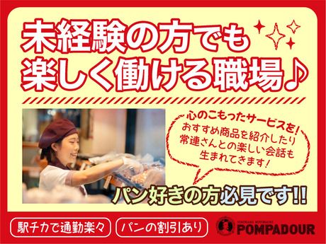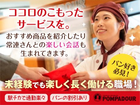 仕事内容 おいしい焼きたてパンをお客様に笑顔でお届けする仕事。就活などに役立つ接客マナーも身に付きます。 商品棚にパンを並べたり、補充をしたり、レジでの接客対応や袋詰め、売り場でお客様へお声掛けをしたり、店内の清掃など、焼き立てパンの販売と接客をお願いします。店舗には工房が併設されているので、焼き立てパンのいい香りの中で働けます。閉店時には、レジ締めおよび閉店作業を担当していただきます。 未経験者大歓迎!幅広い層のメンバーが活躍中です。 「お客様に喜んでいただけること」を一番大切にしているため、経験がなくても素直にアドバイスが聞ける方や接客に興味がある方、新しいことにチャレンジしてみたい方など、前向きに頑張れる方なら大丈夫!先輩たちがしっかりサポートします。 長い歴史と多くの店舗を持つ私たちだからこそ、充実した教育制度があります。安心して始められますよ。 「あいさつ」のような基本から、陳列時のコツなどの細かい作業のアドバイスまで、あなたに合わせてしっかりフォローします。わからないことは先輩にすぐ聞ける風通しの良い社風も私たちの自慢です。 全国で店舗を展開する業界屈指の企業だから、安心して長く働ける待遇や制度もしっかり整っています。 自慢の焼きたてパンがお得に買える社員割引をはじめ、おしゃれな制服貸与、社員登用制度など充実の福利厚生が魅力。もちろんシフトは相談OK◎働きやすさは抜群です! ポンパドウルの創業は1969年。フランス仕込みの焼きたてパンは、全国のお客様に愛されています。 1969年に横浜・元町に1号店を開店して以来、全国に多数の店舗を展開するまで成長した私たち。たくさんのお客様からの「おいしい」や「ありがとう」の声が、私たちのやりがいです。
