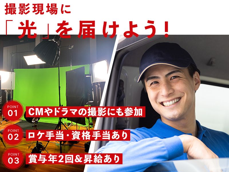 アピールポイント ✅未経験歓迎!安心して働ける職場です →最初は使用する照明機材の説明、 通う頻度の多いスタジオへのルートなど 基本を学ぶことからスタート! 先輩社員がしっかりと指導します 少人数の会社なので社員同士の仲が良く 和気あいあいとした職場です! ✅賞与・昇給あり+資格手当もあり →業績にあわせて、7月と12月の年2回に 賞与を支給しています! また、能力や経験に応じて 年1回の昇給も実施 また、特定の資格を取得した際は 手当も支給します 社員の頑張りは給与面で しっかり還元します!