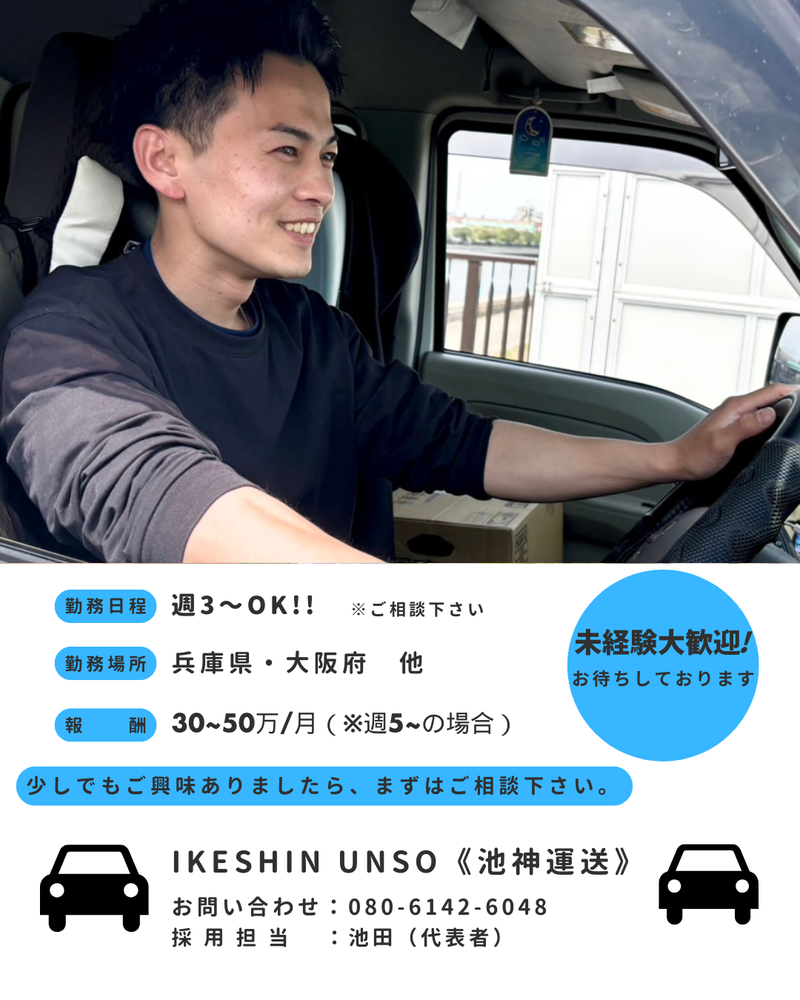 仕事内容: 『運転が好き』『ひとり時間が好きな方』 そんなあなたににピッタリの仕事です! 軽自動車で企業または個人宅へ荷物をお届けします。 荷物は軽量物が中心なので、体力に自信がなくてもOK! トラックでの夜間や日中のお仕事も大募集中! * 固定ルート配送が多く、道も覚えやすい * 未経験から始めた20代~50代スタッフが多数活躍中! * 希望や生活スタイルに合わせて働き方を選べます 【配送エリア例】 阪神エリア(西宮市・尼崎市・神戸市内・大阪市内など) 北摂エリア(吹田市・豊中市など) 上記以外にもございます!まずはご相談ください。 「週5で安定」「週6でガッツリ」「平日のみ」など自由に選べます! その方にあった時間帯などに応じて、案件を選定させていただきます。 今なら、採用頂いた方に3万円プレゼントキャンペーンを実施しております。