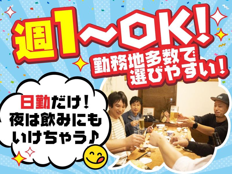 勤務時間詳細 実働時間:1日あたり8時間 平均勤務日数:1ヶ月あたり4日 〜 20日 8:30〜17:30(休憩1時間) ※早く終わっても日給全額保証 ★週1⽇〜勤務OK 「平⽇だけ勤務したい」 「⼟⽇だけ勤務したい」 など働き方は完全自由! ★もちろん週5⽇勤務も可能です! ★お気軽にご相談ください!