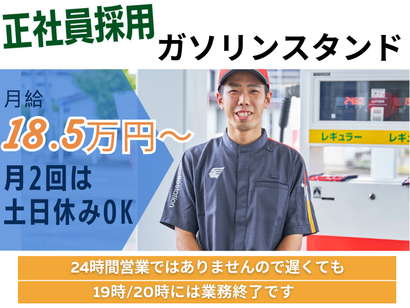 ガソリンスタンド正社員・店長候補として未経験からキャリアアップ可能、月給18~25万+月2回土日休みで安定勤務できるお仕事。