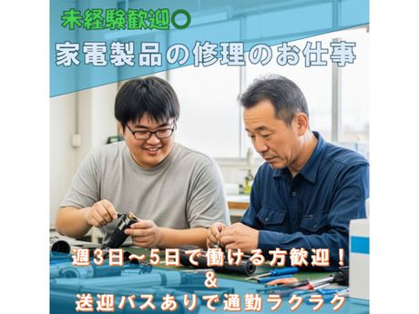 仕事内容 ◆◆ おすすめポイント ◆◆ ┌───────────────────┐ ☆未経験でも高時給☆1日5h~勤務シフト多数◎ シンプル作業&工程が分かりやすいから安心! └───────────────────┘ 人気の社員食堂、更衣室、専用ロッカーなど 職場環境が大充実◎勤務は動きやすい服でOK! いつもの服装で働けるから新しく用意する必要なし! ▼未経験もしっかりサポート!  ̄ ̄ ̄ ̄ ̄ ̄ ̄ ̄ ̄ ̄ ̄ ̄ ̄ ̄ いきなり「ではお願いします」ではなく 入社から独り立ちまで社員のサポートあり♪ 未経験、お仕事復帰やブランクのある方も 安心して始められる安定した環境です♪ ▼座ってコツコツもくもく!  ̄ ̄ ̄ ̄ ̄ ̄ ̄ ̄ ̄ ̄ ̄ ̄ ̄ 周りを気にせずもくもく取り組めます♪ 自分のデスクに座りながらの作業で 長時間立ちっぱなし…なんてこともなし♪ 立ち作業もありますが7割は座り作業です◎ ▼駅からの通勤もラクラク!  ̄ ̄ ̄ ̄ ̄ ̄ ̄ ̄ ̄ ̄ ̄ ̄ ̄ 「安善駅」から徒歩10分& 「川崎駅」から送迎バス運行中♪ 近隣・遠方問わず皆さん活躍中です! ▼都合の良い曜日で週3~5日!  ̄ ̄ ̄ ̄ ̄ ̄ ̄ ̄ ̄ ̄ ̄ ̄ ̄ ̄ ライフスタイルに合わせて ・無理なく週3日で家事両立 ・ガッツリ週5日で収入確保 など、あなたらしく働けます♪ ===== ◆◆ 仕事内容 ◆◆ ★ 仕事内容はコチラ――――――― 家電製品の修理担当または 修理サポートのお仕事をお願いします♪ 扱う製品は大手家電メーカーの 掃除機、扇風機、ドライヤー、加湿器です。 ★ お仕事詳細――――――― 「修理担当」または「修理サポート」 どちらか好きな方を選んでOK! 椅子に座りながらの作業です♪ 【 修理担当 】 (1)修理対象の製品を電動・手動 ドライバーを使用し分解する ↓ (2)新しい部品を棚に取りに行き、 壊れた部品と交換する(台車使用) ↓ (3)部品を交換したら元の形に組み立て直す ↓ (4)最後にPCに修理内容を記録する (PC作業は文字入力程度でOK!) 【 修理サポート 】 ≪下記の中からお好きな業務を選べます≫ ・見積作成(文字入力やコピペができればOK) ・量販店から修理依頼があった製品の 動作チェック・分解、修理箇所がなければ返品 ・量販店とのFAXをやり取りする作業 *入職後も安心のサポート体制あり♪ どちらの業務も1人で作業ができるまでの間 は社員が一つひとつ丁寧にお教えします♪ *重量は10~15kg程度のものを扱いますが 長台車やカゴ台車等を使用しますので 安定した状態で移動時も無理なく安心です◎ ★ 1日の仕事の流れ――――――― (例)9:00~18:00勤務 - 9:00 業務開始 11:30 お昼休憩 12:15 業務再開 (15分休憩あり) 18:00 終業! - 慣れれば1人で作業を進められるので 人が居ると緊張してしまう方でも安心◎ 一連の作業を自分で把握できるので、 スムーズに進められたときの達成感も しっかりと感じられるのが魅力です♪ ★ 職場の環境――――――― 空調完備で季節の影響受けずにお仕事◎ 家電製品を扱うお仕事ですが、 作業を妨げるような騒音はありません ので「うるさいと集中できない…」 なんて心配な方もご安心ください♪ 男女比は男性が6割:女性が4割で、 20代・30代・40代・50代・60代の 幅広い年代の方が活躍中の職場です♪ ===== ◆◆ 当社のご紹介 ◆◆ 2022年1月に創業20周年を迎えた ヤマト・スタッフ・サプライ。 長年培ったノウハウや技術を強みに 人材派遣や教育、軽貨物事業などを 行っています。 多くの人材が安心して活躍できる場を 提供する役割を企業として果たしながら、 豊かな社会づくりへの貢献にも取り組みます。 ===== ◆◆ 勤務地について ◆◆ ヤマト運輸 神奈川ロジセンター 神奈川県横浜市鶴見区安善町1-1-1 <アクセス> ◇安善駅から徒歩10分 ◇横浜駅・川崎駅から送迎バスあり! *自転車・バイク通勤OK(車応相談) 現在活躍中のスタッフさんはほとんどの方が 最寄駅まで電車で通勤されていますが、 自転車やバイクでの通勤もOKです♪(車は応相談) 川崎市内をはじめ、近隣・遠方問わず 様々なエリアから皆さん通われています♪