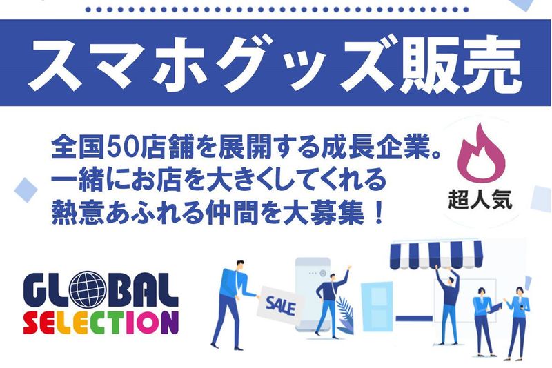 仕事内容 ✨“あなたらしく”働くことが出来ます✨ グローバルセレクションでは髪型・髪色自由なのはもちろん、 勤務中にネイルやピアスを着けるのもOKです♪ シフトも都度ご相談可能ですので、 学生さんや主婦さん、フリーターさんまで幅広く在籍しております! ✅お仕事内容 スマートフォンをはじめ、携帯電話に 関するアクセサリー・アイテムを 多数取り揃えている専門店です! スマホカバーやイヤフォンなど スマホグッズの販売接客や、 レジ、品出し、商品陳列などお任せします。 - <様々な年代の方が活躍中!> 未経験者・主婦(夫)さん・ブランクある方や バイトデビューの方も多数活躍中! 週1日~、1日2時間~勤務OK! プライベートと両立しながら無理なく働けます! 働きがいと働きやすさのどちらも叶う当社で 一緒に働きませんか? <グローバルセレクションとは?> スマホケースをはじめスマホアクセサリーを取扱っています! 平成22年設立以来、順調に業績を伸ばし全国に49店舗を展開しており、 現在は100店舗を目指して大型ショッピングモールを中心に拡大中♪