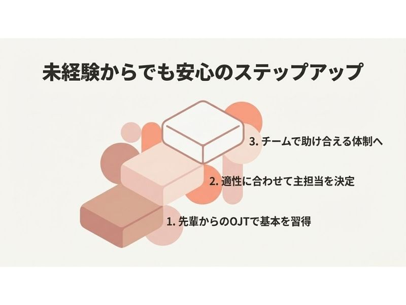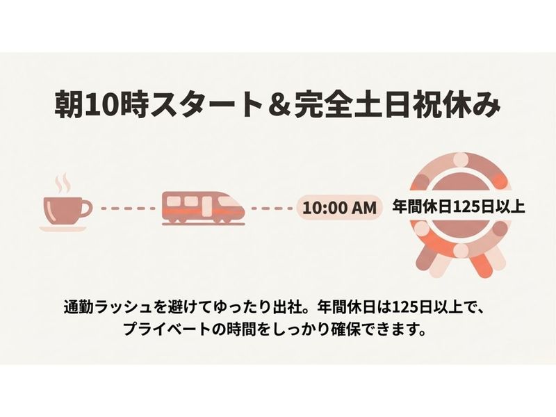 アピールポイント: ◆土日祝休み・年間休日125日以上◆ 友人との予定や、趣味の時間もしっかり確保! ◆通勤ラッシュとは無縁の10:00スタート◆ 家事や身支度など朝の時間にゆとりが持てます◎ ◆「残業ゼロ」が基本です◆ 効率よくテキパキ進め、定時退社が当たり前!