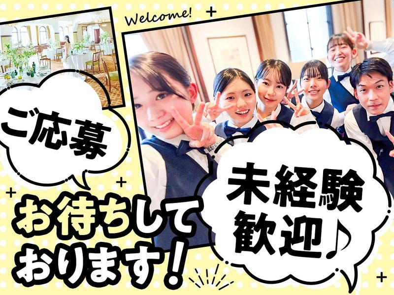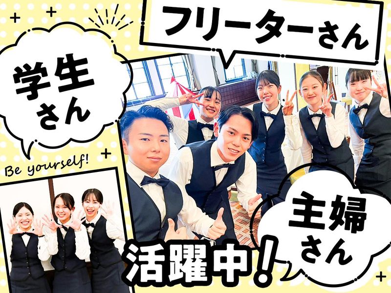 仕事内容 \新たな“バイト青春”をご一緒に/ 春から【新大学生】のみなさんや ちょっとキャンパスライフに慣れてきた 【大学生】のみなさん“大集合”!! もちろん!学生さんだけではありません! ◆保育園のお迎えまで働きたいママさん ◇ガッツリ働きたいフリーターさん ◆“憧れ”を仕事にしたい など・・・ 不安な方は慣れるまでやテスト中は、 《週1日〜OK》です! 少しずつ慣れてくださいね♪ ==【学業やプライベートも大切に】== ★平日だけ・土日だけも可 ☆短時間勤務OK ★日払い・週払い・前払い ☆“定期有”も交通費(700円まで)支給 ★友達と一緒に応募も大歓迎 =================== 【お仕事内容】 新郎新婦さんの“最高の1日"を 学生のみんなでお手伝い! >>具体的には… ・披露宴会場でのサービス業務 ・ゲストのご案内 ・手荷物のお預かり ・ウェルカムドリンクの提供 ・受付・レセプション業務 例えていうと…?? サークルや学校行事をみんなで 作り上げっていくような楽しさです! なので楽しさ・達成感まで♪ *。・。*。・。* 【学校と両立しながら働きたい!】  ̄ ̄ ̄ ̄ ̄ ̄ ̄ ̄ ̄ ̄ ̄ ̄ ̄ ̄ ̄ ̄ >シフトは<学校優先>で大丈夫◎ 急遽予定が入り、シフトをキャンセル したい時は『前日まで』に申請すれば 調整できます! 【将来に役立つ経験をしたい!】  ̄ ̄ ̄ ̄ ̄ ̄ ̄ ̄ ̄ ̄ ̄ ̄ ̄ ̄ ̄ >式場では一流の”おもてなし力”が 学べます!マナーを学びたい方も◎ 就活を控える学生さんは超必見です。 【色んなエリアからアクセス抜群】  ̄ ̄ ̄ ̄ ̄ ̄ ̄ ̄ ̄ ̄ ̄ ̄ ̄ ̄ ̄ 京都駅/京都河原町駅/烏丸駅/ 出町柳駅/山科駅/四条駅/ 竹田駅/西院駅 ・・・etc 「家の近くで働きたい」 「学校帰りに働きたい」など 学生さんからへピッタリです◎ 立命館大学や同志社大学、 龍谷大学や京都産業大学など・・・ お友達を誘って一緒に面接、 バイトスタートもOK♪