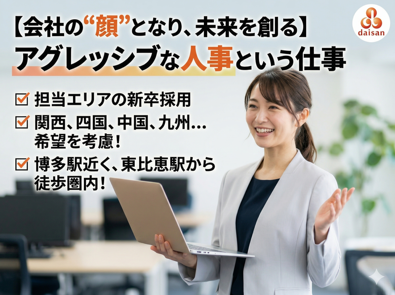 仕事内容 【会社の“顔”となり、未来を創る】 【アグレッシブな人事という仕事】 担当エリアの新卒採用の募集・採用業務。 <具体的なお仕事内容> ・東北、北陸、東海、甲信越・北関東 首都圏エリアの内、いずれかの 担当エリアを受け持って頂き、 店舗で働く方の採用や学校への連絡 訪問などを行います。 ※担当エリアは希望を考慮します。 ・エリアや店舗の状況から 目標の採用人数を算出して 目標達成に向けた採用計画を 立案します。 ・計画に基づいて求人票作成、 求人広告媒体の出稿手配、 スカウトメールの文面作成、 高校や大学の進路指導担当者への 連絡など、採用に向けた 施策を講じます。 ◆採用管理全般 ・応募者管理 …応募者への連絡 店舗へ充足・未充足人数の確認 電話や来客応対、PCでの書類作成 など ★ゆくゆくは面接官や 求人媒体の選定もお任せします! 【ただの事務作業ではありません】 あなたのミッションは 大三ミートの「未来の仲間」を見つけること。 「どうすれば学生さんに興味を持ってもらえるか?」を考え、 求人票を作ったり、 学校の先生と信頼関係を築いたり。 自分の工夫一つで、 新しい店舗に活気が生まれる。 そんな「自分が会社を動かしている」手応えを ダイレクトに感じられる仕事です。 【相談もしやすい環境!】 20代〜30代のメンバーが多く、 オフィスは活気があります。 人事はチームプレー。 困った時は「最近どう?」「この書き方どうかな?」と 自然に助け合える文化です 。 未経験からスタートした先輩も多いので、 あなたの不安もしっかり理解してサポートします 。 前年比約110%で、売上800億円(2025年)。 右肩上がりに成長中! 全国のスーパーやドラッグストアに インストア方式で精肉コーナーを店舗展開。 九州を本拠とし、関東・甲信越 東北・北海道まで480の 店舗を展開している当社での 人事・採用チームを募集します。 「ヒト(人材)、モノ(商品)、カネ(資金)」 は、会社経営の3大資源として 欠かせないものですが、 特に重要となるのが「ヒト」。 各業界人材不足が叫ばれる昨今。 年間30以上というペースで新規店舗を オープンさせている当社では、 各現場で活躍する人材の確保は 欠かせません。 採用成功=新規オープンの成功。 そのために大事なのは 「どうしたらこの街で新卒採用できるか」 「どのようにスタッフを採用し、 長期で働いてもらうか」 といった市場調査。 学生の志向性や求める条件など、 エリアごとの特徴を踏まえた上で 現地の学校の就職課へアプローチしたり、 就活イベントに臨んだりすることが 採用成功へと繋がります。 将来、会社を支える人材の獲得。 会社の発展に大きく貢献する、 やりがいある仕事です。 まずは一つひとつのスキルを 身に付けることから始めましょう。 <安心のサポート体制と充実の待遇> 具体的な評価制度が努力と成長をまっすぐ支えます! 社員寮や賞与、各種手当など待遇も充実◎ 安定した環境の中で成長できるのも魅力! 「自分の可能性を広げたい」 「向上心や学ぶ姿勢を正しく評価されたい」 そんなあなたを応援します◎ <日本全国に店舗を展開> 九州の3店舗から始まった私たち。 1969年の創業以来、着実に業績を伸ばし 年間30店舗の出店実績も。 「安全をどこまでも追求し、信頼を決して裏切らない」を使命として掲げ 「精肉テナントなら、大三ミート産業さん!」 という期待に応え続けています。