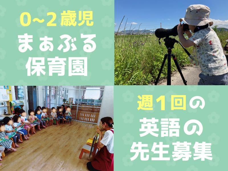 仕事内容 <0~2歳児 19名定員の小規模保育園> ―――・* 英語の先生募集 *・――― ♯週1回、1hの勤務 ♯授業30分・翌週準備30分 ♯楽しく英語に携われる ♯都合が悪い日は曜日の変更もOK 週に1回、0~2歳の園児さんを対象に 英語の先生をお願いします。 遊びの延長で楽しく英語に触れる機会を 子どもたちに与えてあげてください。 ・英語絵本の読み聞かせ ・音楽(歌・リズム) ・ゲーム ・行事企画 (イースター・ハロウィン・クリスマス) など。 教えるのではなく、遊びの中で自然に学べ、 楽しいと思える内容をお任せします。 ☆彡まぁぶる保育園について <小規模×縦割り×担当制の保育園> ●定員19名(0~2歳児)企業主導型保育園 ●担任制ではなく、 常時8~10名程の先生がいて、 皆で子どもたちを見るスタイルです。 ●オリジナルの行事・イベントにも 力を入れています。 ●看護師・栄養士も常駐しているので、 園児の健康管理や病児・病後保育にも 万全に対応可能です。 ~みんなで見守る、保育園です~