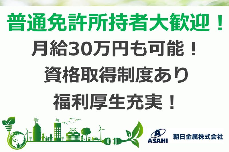 【仕事内容】 ■お客様からの依頼内容に合わせてトラックを手配するお仕事です■ ✅朝日金属株式会社について 創業60年以上、鉄や非鉄金属スクラップの回収・選別して、再生資源としてリサイクルをしている安定企業!現在、約130名のドライバーが活躍し、200台のトラックを保有しています。 環境保全への関心の高まりとともに、リサイクル事業の需要が拡大中。将来性のある職場で安心して長く取り組んでいけます! 【お仕事内容】 お客様から引き取り依頼を受け、ご要望に合わせて適切なトラックを手配したり、トラックの移動距離を計算しながらドライバーさんに業務を依頼したりするマネジメントのお仕事です。 現場作業やドライバーさんの移動が円滑に進むように、電話やパソコン、無線を使って、配車・連絡・調整などの運行管理業務をお任せします。 ================== 経験ゼロでも安心スタート! 充実の研修でスキルアップ! ================== まずは、現場にて1ヶ月程度、取り扱う商品等の知識を学び、徐々に仕事を覚えていただきます。 先輩社員がしっかりとフォロー・サポートしますので、未経験の方も安心してご応募ください。 若手社員も多く活躍しています!仕事をしていく中で日々新しい発見や学びがありますので、自己成長を感じながら働いていただけます。 ※長期キャリア形成のため、20代・30代の業界・業種未経験の方も積極的に採用しています! ※入社時期はご相談ください。