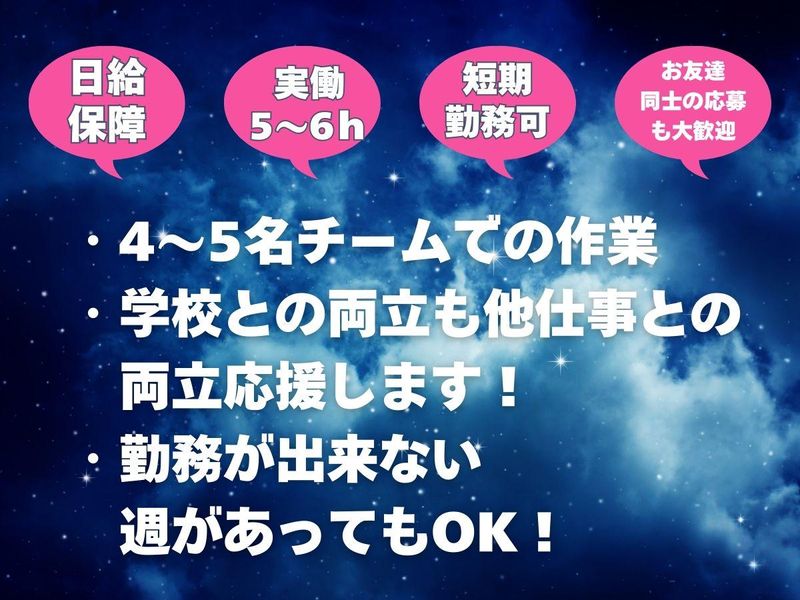 求めている人材 簡単な事から教えていきます。 4~5名の増員募集! 4~5人での現場作業なので特別な知識や経験がなくても大丈夫です。できることからコツコツと覚えてください。 週1日~OK!学校と両立しながら働くスタッフも多数!早く終わることも多々あり!もちろん日給は保障します! 基本8:30に集合して、17:00には会社で解散しています。 どんなに早く終わっても日給は保障! もし残業がある場合は1時間につき1600円~支給♪ 近隣に住んでる方が多く、自転車やバイクで通勤するスタッフも多数。 鶴見、生麦、大口、川崎などから通勤するスタッフ多数。 自分の都合の良い日にお仕事ができます。学生・副業・フリーターさん、みんなが働きやすいように希望シフト制です。 この曜日しか働けない!などあっても融通がきくので、芸能活動と両立するスタッフもいました。 希望収入や希望勤務日はできるだけ考慮しています。 ★都合をつけて働きやすいので、定着率の良い会社です。