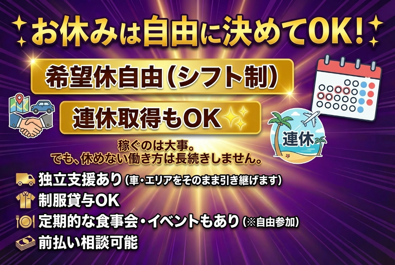アピールポイント: ⭐お休みは自由に決めてOK!⭐ 稼ぐのは大事。 でも、休めない働き方は長続きしません。 だから弊社は【希望休自由(シフト制)】で、予定がある週はきちんと休めます。 連休取得もOK✨ ✅独立支援あり (車・エリアをそのまま引き継げます) ✅制服貸与OK ✅定期的な食事会・イベントもあり (※自由参加) ✅前払い相談可能 ✅車無しで応募OK ─────────────────────────