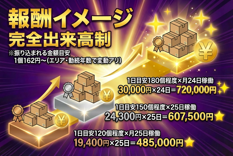 月給450,000円~920,000円 給与: 【報酬イメージ】(完全出来高制) ※振り込まれる金額目安 1個162円~(エリア・勤続年数で変動アリ) ・1日目安120個程度×月25日稼働 19,400円×25日=485,000円⭐ ・1日目安150個程度×25日稼働 24,300円×25日=607,500円⭐ ・1日目安180個程度×月24日稼働 30,000円×24日=720,000円✨ ※車をリースする方はここから3万円が天引きされます。 【先月の実績】 1位:928,760円(稼働半年) 2位:876,890円(稼働1年) 3位:853,470円(稼働1年) 4位:792,530円(稼働4か月) 5位:719,764円(稼働3カ月) 強制で荷物を運ばせることはありません! 自分の稼ぎたい金額に合わせて稼働してください⭐