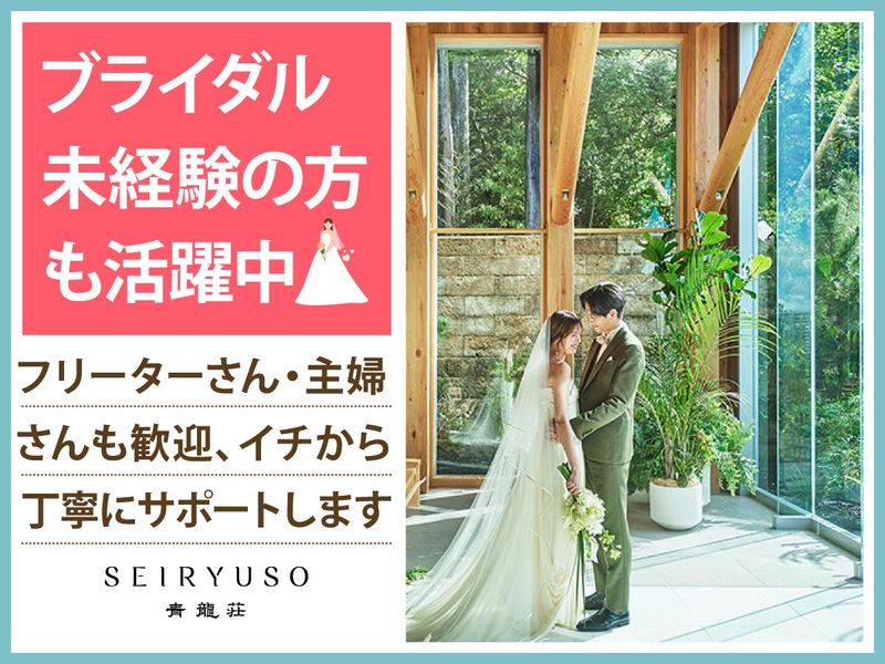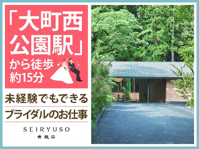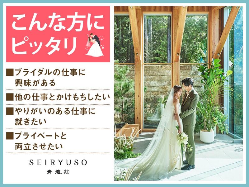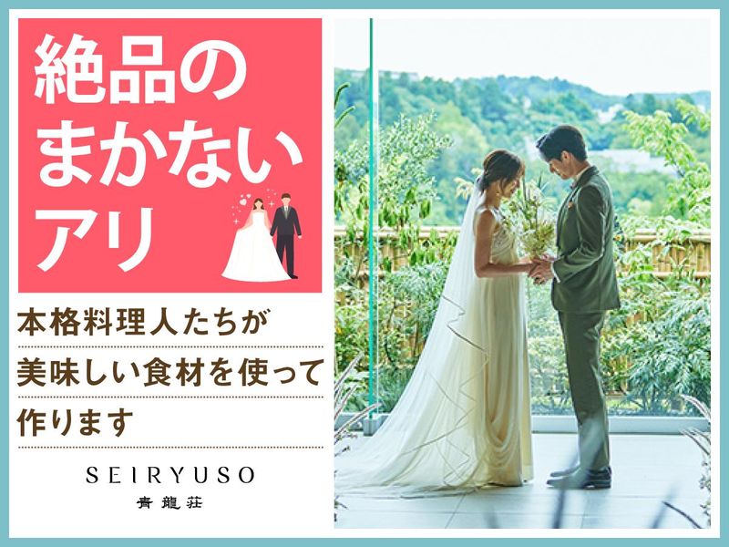 仕事内容 *木造チャペルのある和モダンな結婚式場* 感動いっぱいの結婚式を一緒にサポート♪ 週1~の柔軟シフトでWワーク・副業OK! フリーターさんも活躍中♪ 「人が喜ぶ姿が好き」「サプライズが好き」 という方必見!スキルや経験は一切不要♪ 一緒に素敵な結婚式を演出しましょう* 青龍荘は 和モダンな邸宅の魅力はそのままに、 現代建築を融合した結婚式場。 ウェディングのお手伝いをするお仕事です◎ <主なお仕事内容は…> 結婚式場スタッフとして 次のお仕事をお任せ! ■会場の準備 ■お客様の上着や荷物のお預かり ■お席のご案内 ■結婚式のお料理・ドリンク提供 ―――――――――――――――― かけもち・Wワーク希望の方に オススメのポイントはこちら★★ ―――――――――――――――― ・週1日~1日5時間~OKで融通◎ ・本業が休みの土日だけ等大歓迎! ・かけもち・副業OK! ・絶品のまかないアリ(^^) まかないは本格料理人たちが 美味しい食材を使って作ってくれます♪♪ 10代20代の方が多く、 和気あいあいとした雰囲気です! ―――――――――――――――― 特別な1日をサポートするお仕事 具体的な仕事の流れは? ―――――――――――――――― ▶STEP.1 ミーティング 披露宴の流れやお料理について スタッフ間で事前に確認して 式中にバタバタしないようにします◎ ▶▶STEP.2 披露宴会場の準備 お席に置く名札や ゲストの方に渡す引き出物を確認したり グラスを磨いたりして準備します。 ▶▶▶STEP.3 お客さまのお出迎え 荷物をお預かりし、 待合室でドリンクをお出しします! ▶▶▶▶STEP.4 ホール業務 お席にご案内し、順番にお料理や ドリンクを提供します◎ ―――――――――――――――― 未経験者歓迎! みんなで助け合う雰囲気です ―――――――――――――――― 最初は結婚式の見学からスタート! 見学後は本番じゃないところで、 研修を実施します◎ 「ブライダルは初めて」 「マナーが少し不安…」 そんな方もご安心ください。 不安がなくなるまで、 スタッフ全員でサポートします◎