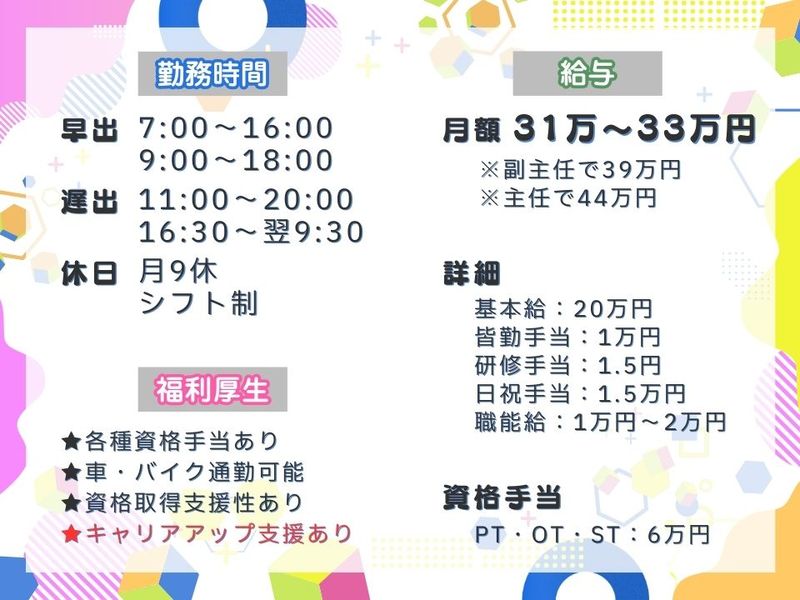 求める人材: <応募条件> ・理学療法士 <その他> ・年齢不問 ・髪色OK/ ネイル、ピアスOK ※当社規定あり