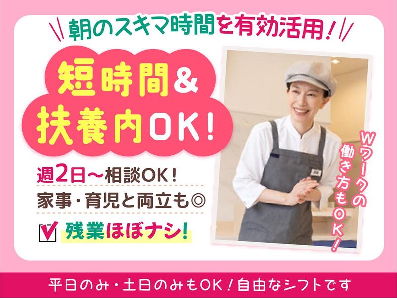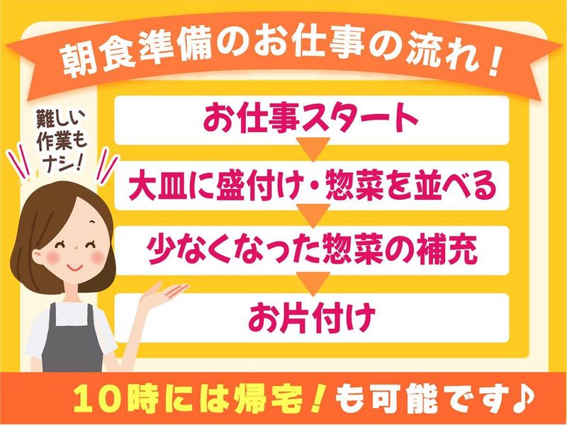 求めている人材 ━━━━━━━━━━━━━━.★..━━ ✨朝の時間を活用したい方におすすめ✨ ⭐⭐未経験からのチャレンジ応援⭐⭐ ━━━━━━━━v━━━━━━━━━ ✨朝の4時間で働く副業・Wワークさん ✨旦那さんがお休みの土日中心の主婦さん ✨授業前に働きたい学生さん など、幅広い方が活躍しています♪ ⏩調理経験や資格は一切不要◎ 簡単な朝食準備や盛り付けがメインなので 未経験の方でも安心して始められますよ♪ ――**――**――**――**―― ⛅こんな経験をお持ちの方は活かせます! 【ファミリーレストラン】 【コンビニ】【ファストフード店】 【居酒屋】【パチンコ店】 【アパレル/ファッション】 【ラーメン屋】【給食】 【社員食堂】【専門料理店】など もちろん全くの未経験でも大丈夫です♪ ――**――**――**――**―― ✨ お気軽にご応募下さい ✨  ̄ ̄ ̄ ̄ ̄ ̄ ̄ ̄ ̄ ̄ ̄ ̄ ̄ ̄ ✅お料理好き大歓迎 ✅未経験者歓迎 ✅Wワーク歓迎/副業OK ✅大学生歓迎 ✅主婦・主夫歓迎/子育て世代歓迎 ✅フリーター歓迎 ✅ブランク歓迎 ✅経験者歓迎 ✅扶養内勤務歓迎 ✅年齢不問・学歴不問・経験不問 ✅男性活躍中/女性活躍中 ✅ミドル・シニア活躍中 ――**――**――**――**――