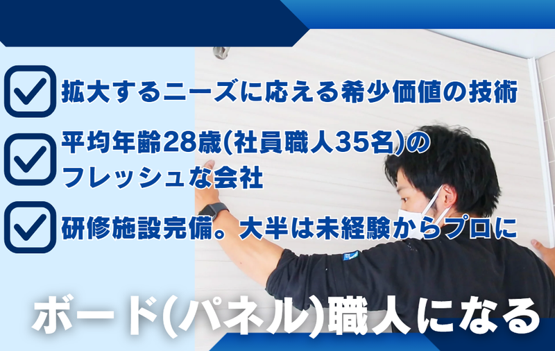 仕事内容 ▛▝▝▝▝▝▝▝▝▝▝▝▝▝▝▝▝▝▝ ▜ 機械には真似できない、 人にしかできない価値がある。 どこへ行っても通用する「本物の技術」 を、未経験から身につけませんか? ▙ ▖▖▖▖▖▖▖▖▖▖▖▖▖▖▖▖▖▖▟ \\この仕事の魅力// ==================== ✨土日祝休み・年間休日125日でお休みたっぷり ✨8割以上が未経験スタート!安心のサポート ✨現場へ直行直帰OK!駐車場代も会社が全額負担 ✨将来の独立も応援!自分のお店を持った先輩多数 ✨コロナ禍でも右肩上がり!安定感抜群の成長企業 ==================== 「業界の常識を変える成長企業」で リフォームのプロになりませんか? 他社には真似できない独自技術で、 古くなったお風呂を新品同様に蘇らせる仕事! |◤ 仕事内容 ◢|  ̄ ̄ ̄ ̄ ̄ ̄ ̄ ̄ ̄ ̄ ̄ ̄ ̄ ̄ ̄ ̄ ̄ ̄ ̄ ̄ ホテルや中古住宅などの「古くなったお風 呂」を、壊さず・安く・キレイに再生させる 当社独自の「エコバスリフォーム」を担当 していただきます! 具体的には…  ̄ ̄ ̄ ̄ ̄ ̄ ̄ ⏩お風呂をピカピカに塗り替え └ 特殊なスプレー機械を使って、 浴室全体をキレイに塗装します。 ⏩専用のシートやパネル貼り └ 壁や床に専用の材料をピタッと貼り、 新品のような見た目に仕上げます。 ⏩丁寧な準備(養生・下地処理) └ 作業場以外が汚れないようシートを 被せたり、塗装が剥げないようデコボコを 平らにしたりする一番大切な「基礎」の 作業です。 ⏩仕上がりのチェックと報告 └ 工事が終わったら、ムラがないか確認。 写真を撮ってスマホで報告すれば完了! 機械やAIにはできない「繊細な職人技」を、 イチから丁寧に教えていきます! ●エコバスリフォームについて  ̄ ̄V ̄ ̄ ̄ ̄ ̄ ̄ ̄ ̄ ̄ ̄ ̄ ̄ 当社のリフォームは、今あるお風呂を 「壊さない」のが最大の特徴です。 だから、大きな音も出ずゴミも少ない、 環境に優しいやり方なんです。 また、塗装だけでなく、電気・水道・内装 など、リフォームに必要なあらゆる技術が 身につきます。どこへ行っても重宝される 「住まいのスペシャリスト」へと成長できる 環境です◎ ✅未経験者を放っておかない!教育体制  ̄ ̄ ̄ ̄ ̄ ̄ ̄ ̄ ̄ ̄ ̄ ̄ ̄ ̄ ̄ ̄ ̄ ̄ ̄ ̄ 社員の平均年齢は28歳と若く、実は8割以上 が全くの未経験からのスタート!先輩が隣で 教えるマンツーマン指導に加え、いつでも スマホで見られる「動画マニュアル」も 完備。自分のペースで復習できるから 安心です。 ✅「働きやすさ」を追求した環境  ̄ ̄ ̄ ̄ ̄ ̄ ̄ ̄ ̄ ̄ ̄ ̄ ̄ ̄ ̄ ̄ ̄ ̄ ̄ ̄ 会社に寄らず、直接現場へ行ってそのまま 帰れる「直行直帰」スタイル。独り立ち すれば専用の車を貸し出し、駐車場代も 会社が払います! 頑張った分は毎月のボーナス(月1~3万円) として還元されるので、やりがいも十分です。 ✅「いつかは社長に!」そんな夢も応援  ̄ ̄ ̄ ̄ ̄ ̄ ̄ ̄ ̄ ̄ ̄ ̄ ̄ ̄ ̄ ̄ ̄ ̄ ̄ ̄ 将来、自分の会社を持ちたい方も大歓迎 です!独立後も、当社から仕事をお願い するなど、パートナーとして支え続ける 仕組みがあります。 すでに12名の先輩が、ここから独立して 社長として活躍しています◎ ✅建設業界では珍しい「土日祝休み」  ̄ ̄ ̄ ̄ ̄ ̄ ̄ ̄ ̄ ̄ ̄ ̄ ̄ ̄ ̄ ̄ ̄ ̄ ̄ ̄ 年間休日はたっぷり125日!ITツールを導入 して無駄な事務作業をカットしているので、 残業もグッと少なめです。 「仕事も大事だけど、趣味や家族の時間も しっかり確保したい」という方にぴったりです。 |◤ 当社について ◢|  ̄ ̄ ̄ ̄ ̄ ̄ ̄ ̄ ̄ ̄ ̄ ̄ ̄ ̄ ̄ ̄ ̄ ̄ ̄ ̄ 2000年に誕生した、浴室リフォームの パイオニア企業です。独自の「壊さない 工法」で全国から依頼が絶えず、 関西・東京・名古屋を中心にどんどん拠点を 広げています。 ※転勤はありません。 ■先輩たちのインタビュー動画はこちら 《https://bsd.ecobath.com/company/recruit/#tab_panel-2》 ●SNSでも日常を公開中!  ̄ ̄V ̄ ̄ ̄ ̄ ̄ ̄ ̄ ̄ ̄ ̄ ̄ ̄ ̄ ̄ ̄ ̄ どんな人が働いているのか、会社の雰囲気は どうなのか?SNSでリアルな姿を発信して います。ぜひチェックしてみてください!
