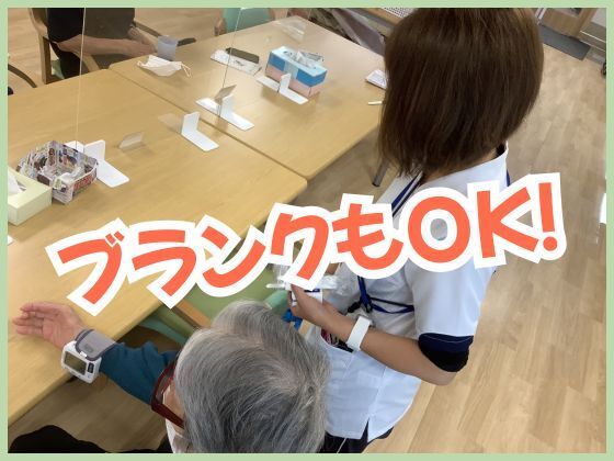 PR POINT1アットホームな介護施設で働きやすい職場 デイサービスをメインとした介護施設での勤務となります。 デイサービス看護師業務は、バイタル確認、機能訓練、介護業務の3本柱で行っています。看護業務ばかりするのではなく、機能訓練の業務や介護業務がございます。 POINT2日勤のみ 残業ほぼなし 家庭との両立もしやすい環境です。 未経験者もしっかりサポートしますので、長く働ける環境です。 終わりは18時で残業も少なめ、家事との両立可能で働くママさんも安心して働けます。 「以前、介護の仕事をしていた 」などのブランクのある方も歓迎です POINT3日勤のみで働ける 長期ブランクがあっても大丈夫 ご結婚や出産で、一度医療の現場を離れられた方にはオススメの職場です POINT4充実の待遇とキャリアステップで長期就業もサポート 交通費支給(3万円迄)、制服貸与、資格手当等、充実した待遇。 現在、無資格の方でも大歓迎。これから介護福祉士や各種介護の資格取得を目指す方も働きながらのステップアップができます。 POINT5この職場の好きなところエピソード ご利用者様の参加型ワークショップで書いてもらった絵を天井に飾り付けをする企画を提案・実施しました。 自分が書いた絵を施設に飾ってもらうことで、とてもご利用者様に喜んでもらえた経験があります。 自分がやった方が良いと思えることは、経験・年齢関係なく提案できることがやりがいに繋がっています。