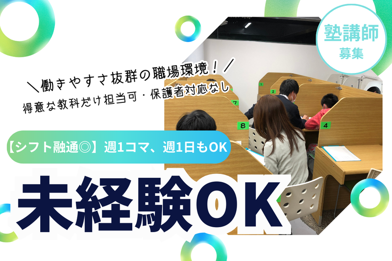 求めている人材 ◤ ̄ ̄ ̄ ̄ ̄ ̄ ̄ ̄ ̄ ̄ ̄ ̄ ̄ ̄ ̄ ̄ ̄ ̄ ̄ 学生さんや社会人の方中心に活躍中! 学業や本業との掛け持ちも応援◎ ___________________◢ ✨塾講師としての実務経験は問いません! ✨学歴による応募条件は設けておりません ✨やる気・姿勢・意欲を重視した採用です 主婦(夫)さんや社会人のWワークなど、 間違いなく活躍できる環境です♪ ┈┈┈┈┈┈┈┈┈┈┈┈┈┈┈┈┈┈┈┈ \ こんな方におすすめの職場です / ┈┈┈┈┈┈┈┈┈┈┈┈┈┈┈┈┈┈┈┈ ✅得意な科目を活かして指導を行いたい方 ✅学業や本業と両立しながら働きたい方 ✅正当に評価される環境を求めている方 ✅社会人経験を教育の現場で活かしたい方 学歴を条件とした募集は行っていませんが、 実際には理解力や意欲の高いスタッフが多く 定着率が良いのも魅力のひとつです! 年齢や立場に関係なく、 指導の質や日々の取り組みを 大切にする文化が根付いています。 塾講師未経験・ブランクがある方もOK! 自信のある科目からお任せします。 もちろん、塾講師の経験者は大歓迎です!