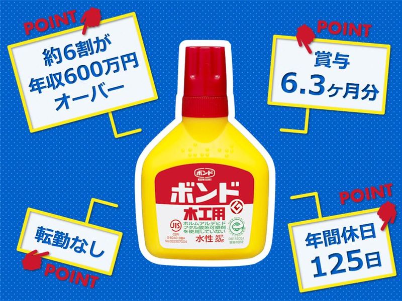 【保険制度】 雇用保険、労災保険、健康保険、厚生年金 待遇・福利厚生 【福利厚生】 資格取得支援 報奨金制度 退職金制度 再雇用制度(65歳まで) 企業年金制度 財形貯蓄制度 表彰制度(優秀社員表彰、永年勤続表彰) 社用車貸与 社宅あり/家賃・共益費の20%と光熱費自己負担 コニシグループ従業員持株会制度(コニシの株を購入可。10%奨励金支給) 会員制リゾートホテル(エクシブ等)