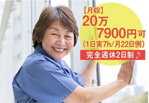 求めている人材 ◎未経験の方も大歓迎! 親切丁寧な研修で安心スタート ・日常清掃等の経験者は尚歓迎! ・家事と両立して働きたい方! ・~15時位に退勤したい方♪ ♥30代・40代・50代/主婦さん活躍中 ♥60代以上/主婦・女性活躍中♪ 【こんな方々にもオススメ】 ◎コツコツ作業するのが好き ◎デスクワークはちょっと苦手 ◎土日祝日はお休みしたい♪ ◎人に喜ばれる仕事がしたい ◎長期安定した収入を得たい方 (月収20万7900円以上可) ◎近隣や周辺にお住いの方