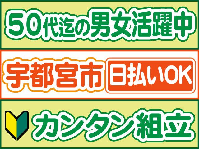 仕事内容 シニア・中高年の方も活躍中! 軽量部品の組立スタッフ募集! 重量物はないので安心 〇初心者の方も安心して始められます 【組立スタッフのポイント】 〇単純作業×もくもく作業 〇未経験OK 〇日勤のみ 〇仕出し弁当あり 〇土日休み 〇冷暖房完備 〇20代30代40代50代の男女活躍中 〇シニア・中高年活躍中 〇日払いOK(規定内) 〇職場見学OK 〇履歴書不要 〇派遣デビューの方もOK 〇「マイリク定着支援」導入企業! 【組立スタッフの仕事内容】 ・部品を手で組付けたり、電動ドライバーを使用して 組み立てる作業をお願いします! ・扱う部品は軽量な物ばかりで安心。 組立についても簡単な手順なので経験の方でも活躍できます! 職場のサポート体制もバッチリです! 事前に職場見学もございます! まずはお気軽にお問い合わせください!! 【勤務について】 〇日勤のみ(8時~17時) 〇土日休み 急な発熱・体調不良・冠婚葬祭など、 突発的なお休みに柔軟に対応しております。 【経験活かせます!】 〇工場内組立作業パート・アルバイト 〇工場内分析業務パート・アルバイト 〇データ資料まとめパート・アルバイト 〇設備オペレーターパート・アルバイト ブランクある方もOKです! ご不明な点はお気軽にお問い合わせください。 お電話でのご応募も受付中! 株式会社ロフティー 小山支店 TEL0800-222-6888(フリーダイヤル) 採用担当まで お仕事情報などはこちら https://entori.jp/lofty-oyama コーディネーター・定着支援のWサポート体制導入 「マイリク定着支援」導入企業! アンケートで職場の様子を確認し、 コーディネーター・定着支援担当が連携してサポート。 はじめての派遣でも安心して働けるよう迅速かつ 丁寧にサポート対応いたします。