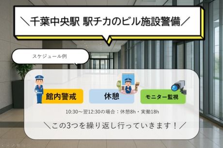 仕事内容 【なんと駅チカ徒歩3分!周辺施設も充実だから帰りにショッピングも♪】 ~ビル内を見回って安全を確認し、来訪者の受付対応や監視を行うお仕事です~ ◇ビルの巡回業務 ◇受付対応 ◇施設内の安全チェック・モニター監視業務 *.゜☆時給1,300円~1,625円☆.゜* ☆゜.*日給換算22,750円~24,050円*.゜☆ \駅チカだからアクセス◎/ 千葉都市モノレール 葭川公園駅:徒歩3分 京成線 千葉中央駅:徒歩8分 JR千葉駅:徒歩12分 雨の日の通勤もラクラク♪ お仕事帰りにそごうやペリエでもショッピング出来ちゃう♪ ◇未経験者歓迎!スタート時の未経験率は99% ◇現場に出る前に事前研修があるので安心! ◇交通費や装備品も全て支給! 【お仕事のやりがい】 ◇安心を提供する喜び 建物やその利用者の安全を守ることで、多くの人の役に立っている実感が得られます。 日々の業務が「安心」という目に見えない価値を提供しているのです(*‘∀‘) ◇規律ある生活の実現 定期的な巡回やチェックなど、規則正しい業務が求められるため、 規律ある生活を送ることができます。仕事を通じて自己管理能力が高まりやすいです('◇')ゞ ◇対人スキルの向上 来訪者対応や出入管理の中で、円滑なコミュニケーションスキルが自然と磨かれます。 利用者とのやりとりが和やかな雰囲気で行えると、それが日々の楽しみになることも!(*'▽') 【こんなあなた、お待ちしております】 ◇週5日で働きたい ◇週2など、マイペースに働きたい ◇家計の足しに無理なく ◇定年後の第二の職業として ~ 職場環境 ~ ☆創業以来、29年連続、黒字経営! ☆教育が行き届いたエムサスの警備士には、クライアントからのオファーが年々増加中!将来的にも安心して働けます! ☆こんな警備会社みたことない!年末の忘年会で旅行や和牛などの豪華景品が用意されています!
