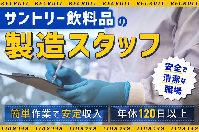 仕事内容 \ここがポイント!/ ・年間休日121日と賞与3.6ヵ月支給実績あり ・未経験から始められる研修制度&マニュアル完備 ・入社後は社宅費用会社負担(家具家電付き)で安心スタート ・チームで働ける環境&新工場のスターティングメンバー <仕事内容> サントリーの人気飲料ブランド(伊右衛門・特茶・クラフトボス など)の製造をお任せします。 9割以上の先輩が未経験スタート!研修制度も整っているため、安心して始められる環境です。 <具体的には> 適性や希望を考慮し、以下いずれかの工程を担当いただきます。 マニュアル完備&QRコードを活用した管理システムがあるのでシンプルで分かりやすい作業です。 原料受入れ工程:トラックからの荷下ろし、リストに基づく検品、フォークリフト作業 中味工程:原料の計量・投入・抽出、機械洗浄 包装工程:ラベル貼り機や検査装置の操作、箱詰め、設備メンテナンス