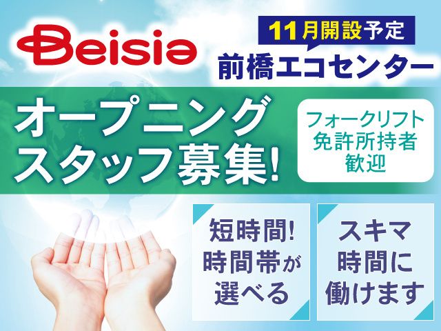 仕事内容 < ベイシアがリサイクル事業スタート > 短時間/パート 2025年冬< 11月開設予定 > 「ベイシア初」の資源物リサイクル工場で 一緒に働くスタッフを募集! オープニング募集なので皆同じスタート! ※11/17以降の入社です ============== 地球にやさしい循環型社会を目指して ベイシアがリサイクル事業をスタート 全店にリサイクルポストを設置! そこで回収した資源物や 納品時の段ボールなどの 資源をリサイクルをするお仕事です! ============== \ おすすめポイント!/ ・未経験やブランクあってもOK ・フォークリフト免許あれば時給100円UP ・週4日、1日4時間の短時間 ・時間帯が選べるので働きやすい! ・髪色髪型自由! ・リサイクルやサスティナブルな 取り組みに興味のある方にもおすすめ! ・新事業の立ち上げなので みんな一緒のスタートで安心 < 主なお仕事内容 > 段ボール・ペットボトル・ 発泡スチロール・アルミ缶・ スチール缶のリサイクル業務、 資源物の運搬、機械操作、清掃 具体的には、 ・資源物の工場内運搬 ・資源物の分別や洗浄 ・再資源化するための機械操作 ・工場内の簡単な清掃 などをお願いします 様々な工程があるので、 適性や経験に合わせて働けますよ! 難しい作業はありませんので、 未経験やブランクがあっても大丈夫! < オープニングスタッフ > オープニング募集なので、一緒に働く スタッフ皆さんスタートが一緒! 経験よりも一緒にリサイクル事業を 盛り上げてくださる方を歓迎します! お仕事未経験の方や業務が不安な方も ゆっくり仕事を覚える時間があるので、 ご安心ください! < 資格や経験あれば活かせます > 工場内での資材運搬の工程あるため フォークリフト免許があれば 即戦力として歓迎します! その他、 機械オペレーターや製造工場経験、 品目問わずリサイクル業の経験、 仕分けや分別などの作業経験が あれば業務に活かせると思います! < サスティナブルな社会を目指します > 段ボール・ペットボトルなどの リサイクル業務を通じ、 サステナブルな社会を実現するための 取り組みを行っていきます。 環境や社会に配慮したお仕事始めませんか!