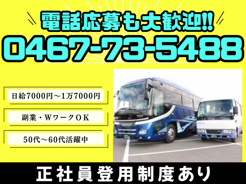 仕事内容 // ✨送迎バスのドライバー募集♪ ✨週2日以上、土日できる方歓迎◎ ✨大型免許を活かして働ける! \\ 【仕事内容】 ✅企業送迎 ✅冠婚葬祭時の送迎 ✅幼稚園の児童送迎 等のドライバー業務をお願いします。 ⭐1日1~3便(1便/3~4時間) ※空き時間は基本自由行動可能です! 【運転エリア】 藤沢、海老名、大和、 厚木方面がメインとなります。 【仕事の流れ】 業務の流れは会社に出社し、 バスの掃除や点検を行ってから 運行業務に出発して頂きます。 \安心の研修制度あり⭐/ 座学・同乗研修制度もあり、 1人立ちができるように しっかりとサポートしますので、 未経験の方もご安心ください!