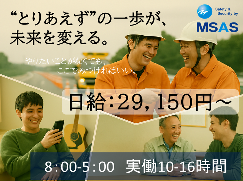 仕事内容 ―――――――――――――――――――― “今の仕事、本当に夢を追う力になっていますか?"  ̄ ̄ ̄ ̄ ̄ ̄ ̄ ̄ ̄ ̄ ̄ ̄ ̄ ̄ ̄ ̄ ̄ ̄ ̄ ̄ 音楽やSNS配信、創作活動、俳優としての挑戦──。 夢を追うには、「お金」も「時間」も必要です。 当社では、あなたのように夢を目指しながら活躍する先輩が多数在籍! ここで働く事で、夢を叶える力を手に入れませんか? 月15日勤務で月収40万円稼ぐことも可能な高日給だから、「夢のために時間を使いたいけど、バイト時間を減らすと生活費がキツイ…」なんてことはありません。 現場が早く終わっても日給保証だから安心して働けます! あなたの「夢」を支える警備の仕事が、ここにあります。 ■\おすすめPoint/  ̄ ̄ ̄ ̄ ̄ ̄ ̄ ̄ ̄ ̄ ✅月15日勤務で月収40万円可能 ✅シフトは1週間ごとの自己申告制 ✅長期休みも相談OK ✅50勤務まで入社祝い金支給 ✅寮完備▶賃料1ヶ月無料キャンペーン中 ■\お任せする仕事内容は?/  ̄ ̄ ̄ ̄ ̄ ̄ ̄ ̄ ̄ ̄ ̄ ̄ ̄ ̄ ̄ レアな体験もできる!? 高速道路での規制設置撤去作業 <具体的には> ・高速道路の車線規制時に必要なコーンや看板の設置・撤去 ・回転灯やLED看板搭載の特殊車両、発炎筒を使用して交通規制 ・規制内への車両流入・流出の管理、通行車両の監視、規制内巡回 ・一般道路での同様の業務や交通誘導業務もあり ・工事現場での安全確保のための警備業務 ・イベント会場での交通誘導や人流管理 ・夜間作業時の照明設置や撤去 <チーム構成> ・基本的に2~8人のチームで作業 ・未経験者歓迎!スタート時未経験率99% ・事前研修あり、チームで動くので安心 ■\実例:元バンドマンの先輩エピソード/  ̄ ̄ ̄ ̄ ̄ ̄ ̄ ̄ ̄ ̄ ̄ ̄ ̄ ̄ ̄ ̄ ̄ ̄ ̄ ̄ ✅15歳:バンド活動をスタート ▽ ✅~20歳頃まで:バイトも掛け持ち ・バンド資金を稼ぐため、倉庫作業や飲食など複数掛け持ち ▽ ✅20歳:エムサスと出会う。 ・「高速道路での非日常的な仕事」という広告に惹かれ、エムサスに応募 ・面接時に警備の仕事と知ったが、「乗りかかった舟」と軽い気持ちでスタート ▽ ✅転職:一度エムサスを離れ、他業種へ ・1社目は諸条件が合わず、2社目は人間関係が上手くいかず、退職 ・この間もエムサスで仲の良かった方とは連絡を取り続けていた ▽ ✅再就職:再びエムサスへ ・元同僚から「良かったら戻っておいでよ」と声をかけられる ・「労働条件が整っていて居心地が良かった」ことを思い出し、復帰を決意 ▽ ✅復帰後:バンド活動と掛け持ち ・ある日、バンド活動中に膝のじん帯が断裂! ・2週間の入院後、1年間は歩行訓練のリハビリが必要となる大怪我で働けなくなる ・「働けないから退職しなければ…」「無収入になる」という不安に襲われる ▶仕事中の事故ではないのに経理の方が保険の相談に乗ってくれたり、当時の支店長が「事務(内勤)の仕事をしてみないか?」と誘ってくれるなど、会社全体が親身になってくれた。 ▶「こんなに良い人が多い会社は他にはない!」と実感し、覚悟を決めて29歳で正社員にステップアップ! ■\元バンドマンの先輩が語る/ この仕事の魅力とは?  ̄ ̄ ̄ ̄ ̄ ̄ ̄ ̄ ̄ ̄ ̄ ̄ ̄ ̄ ̄ ̄ ̄ 最大の魅力は、毎日同じ作業の繰り返しではないこと。 都内全域から神奈川県内へも行けるので、仕事を通じてちょっとした「プチ旅行気分」を味わえます。 同じ現場でも日によって異なる状況に対応するため「飽きない」のが特徴です。 常に新しい発見と工夫ができる余地があるのが魅力! 自分が創意工夫した結果、「ありがとう!」「お兄ちゃんのおかげで安全に仕事ができるよ!」といった感謝の言葉を直接聞けることは、大きなやりがいにつながっています。 ■\先輩が語る「当社の魅力」は?/  ̄ ̄ ̄ ̄ ̄ ̄ ̄ ̄ ̄ ̄ ̄ ̄ ̄ ̄ ̄ ̄ ̄ ̄ エムサスの最大の魅力は【居心地の良さ】。 年齢層は10代~70代まで幅広く、特に年配の先輩方は人生経験が豊かで「痛みを知っているからこその優しさ」を持つ世話好きの方が多いです。 まるで「親戚のおじさん、おばさんに囲まれた感じ」で、温かい気持ちで仕事に取り組めます。 警備士、管制、経理の距離感も近く、気軽に話せる環境も自慢! 夢を追うために働きたい方はもちろん、「やりたいことが見つからない方」も大歓迎です。 ”とりあえずのチャレンジ”も応援します!