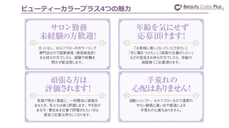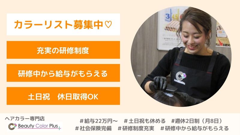 仕事内容 「美容師に戻りたい、けれど手荒れやブランクが不安…」 そんな悩みを持つ方にこそ選んでいただきたい、新しいスタイルのヘアカラー専門店です。 ブランクあり、未経験の方大歓迎です! \年間休日120日のワークライフバランス重視のあなたへ!/ 1. 現場の「負担」を徹底的にカットしました 当店では、スタッフが施術に専念できるよう、以下の業務をすべて自動化・外部委託しています。 ⭐受付・電話対応なし 予約やお問い合わせはすべて本社のコールセンターが対応。券売機を導入しているため、レジでの現金の受け渡しや締め作業も一切ありません。 ⭐カラー調合は全自動 薬剤の調整は専用の機械が行います。カラー見本から選ぶだけなので、複雑な配合の知識や経験がなくても、誰でも正確に色を作ることが可能です。 ⭐オートシャンプー完備 襟足や顔周り以外の洗浄は機械におまかせ。手荒れ防止の手袋も着用できるため、肌荒れや爪の変色が心配な方も安心して働けます。 2. ブランクがある方も、自信を持って復帰できる環境 技術のカット業務は一切ありません。「色を塗る」というシンプルな工程に特化しており、会話や塗り方の手順をまとめた詳細なマニュアルも完備しています♪ 久しぶりの現場復帰で、感覚を取り戻したいという方も大歓迎です。 3. 新店舗のチーム体制について 2026年4月にオープンする新店では、常時3〜4名のスタッフが在籍予定です。 「スタッフ一人ひとりの負担を減らすこと」を最優先に考え、最新設備とサポート体制を整えてお待ちしています。