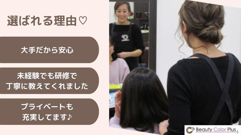 求めている人材 学歴・年齢不問 美容師免許必須 *ブランクある方も歓迎! 【こんな方も歓迎します】 *仕事復帰をお考えの方 *主婦(夫)さん *ライフワークバランスを大事にしたい方 *未経験OK! *美容に興味があれば大丈夫☆ その他・・・ ◆美容業界でスタッフとして従事していた方、活躍中! \こんな方にもオススメ/ エステ・エステティシャンなど美容に関する勤務経験がある方 美容院・理容院・サロンでの経験を活かしたい方 フェイシャル・ブライダル・ボディケアに携わってみたい方 お客様の喜びを感じられる職場で働きたい方 落ち着いた空間で働きたい方 人との対話が好きな方 コミュニケーション能力がある方