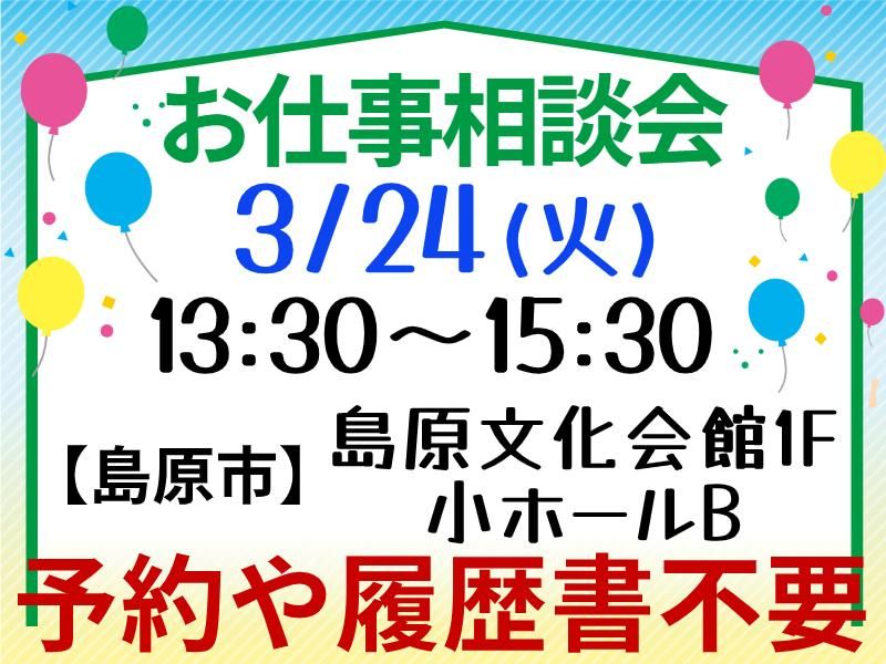 選考プロセス WEB・電話応募どちらも可!WEB面接OK ☎0120-68-2209 ■応募⇒面接⇒採用 ※応募~最短3日間で入社可! ※応募に相談会の参加は必要なし 【お仕事相談会】 ※予約&履歴書不要!服装自由! ※希望者のみ事前説明いたします *3/24(火)13:30~15:30 【島原市】島原文化会館 1F 小ホールB *4/8(水)13:30~15:30 【長崎市】メルカつきまち5F A1会議室 *4/22(水)13:30~15:30 【大村市】サンスパおおむら 商業棟2F 小会議室A ―――――――――――――――――― 「日程が合わない…」という方もOK! 長崎事業所(諌早市栄田町)で随時、 お仕事のご紹介が可能です! まずは、お気軽にご相談ください! ――――――――――――――――――