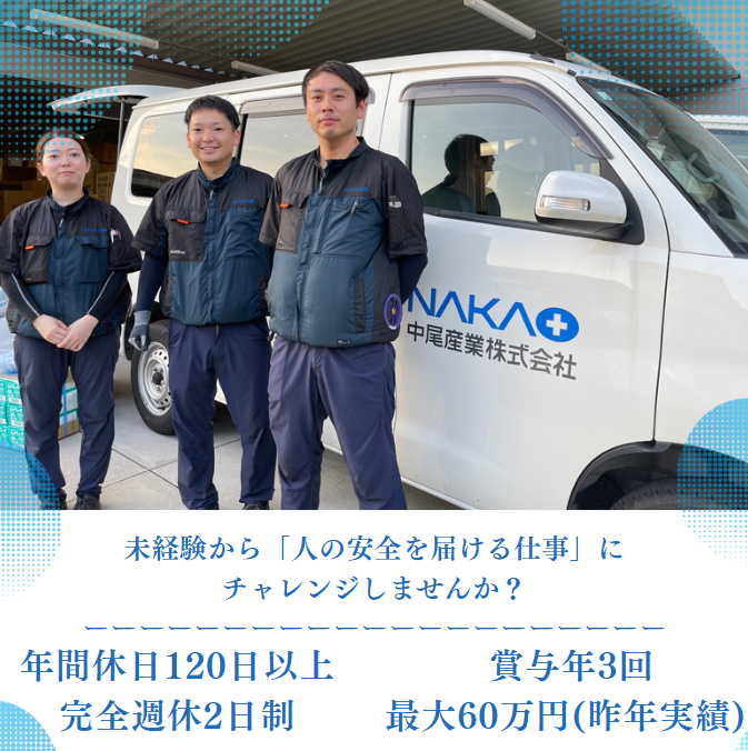 仕事内容 \景気に左右されない安定基盤!未経験から始められる配達スタッフ募集/ 「安定した会社で腰を据えて働きたい」 「運転は好きだけど、配達の仕事は初めてで不安…」 そんなあなたにピッタリの職場です。 私たち中尾産業は、働く人の安全を守る「労働安全衛生保護具」専門メーカー。 大手企業との直取引を強みに、景気に左右されない安定した需要を基盤に成長を続けています。 ○┈┈┈*この求人のアピールポイント*┈┈┈○ ⭐ 未経験OK! 丁寧な研修&同乗指導で安心スタート ⭐ 賞与は年3回(昨年度実績 最大60万円) 頑張りをしっかり評価 ⭐ 月給22万円~32万円+昇給・手当あり。地域相場を上回る安定収入 ⭐ 年間休日120日以上/完全週休2日制(土日祝)でプライベートも充実 ⭐ 大手企業との直接取引で、社会貢献性の高い“ものづくり”に関わる ⭐ マイカー通勤OK(駐車場あり)&駅徒歩5分の好立地 ■具体的な仕事内容 労働安全衛生保護具(作業服・手袋・前掛けなど)を取引先へお届けするお仕事です。 ✅ 車両・免許要件 ・普通車・バン(車両総重量3.5t未満/AT限定可) ・2t車以上の業務はありませんので普通免許でOK ・準中型免許の取得支援制度あり ✅ 配達エリア・件数 ・愛知県内中心(名古屋市・豊田市・東海市など) ・1日20~30件程度、ルートはほぼ固定 ✅ 取扱商品と作業 ・軽量品~20〜30kg程度の労働安全衛生保護具 ・カゴ台車や台車を使用し、手積み負担は少なめ ✅ 安全装備・労務管理 ・全車ドラレコ・バックカメラ搭載 ・点呼・アルコールチェック・健康診断を実施 ・2024年改正の「改善基準告示」に沿った労務管理を徹底 \職場環境も安心/ 日勤のみ/夜間配送なしで生活リズム安定 無理なスケジュールなし。残業は月30時間程度 配送ルートも徐々に慣れていけるように研修 ■会社について 私たちは、働く人々の安全を守る「労働安全衛生保護具」の専門メーカーです。 景気の波に左右されない安定した需要を基盤に、大手企業様との直接取引で強固な経営基盤を築いています。 未経験からスタートした先輩社員も多数活躍中。 あなたの“安全運転”と“誠実さ”が、お客様との信頼を築く大切な力になります。 ■こんな方に向いています ✅ 安定した経営基盤の会社で長く働きたい ✅ 運転が好きで、体を動かす仕事に興味がある ✅ 年間休日120日以上・完全週休2日制で、私生活も充実させたい ✅ 未経験からでも正社員としてキャリアを築きたい 運転が好き、体を動かすのが好き、安定した会社で長く働きたい。 そんなあなたにぴったりの仕事です。 未経験から「人の安全を届ける仕事」にチャレンジしませんか?