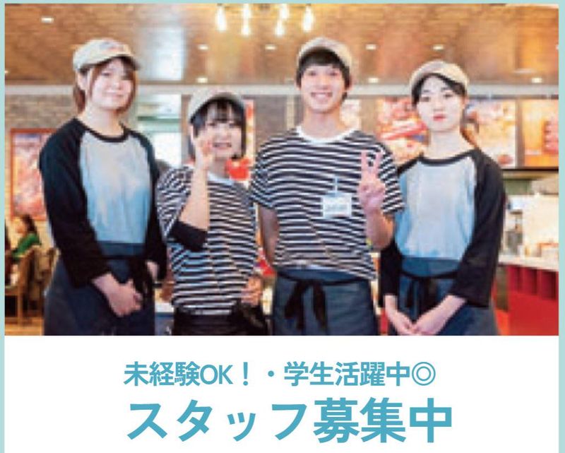 求めている人材 ★大学生・高校生歓迎! (大分大生多数在籍!) ★フリーター・Wワーク歓迎! ★髪型・髪色自由 ★未経験OK ★シフトも融通が利くので予定と合わせやすい! *-* ✅ディナーは学生さんとフリーターさん、 ランチは主婦・主夫さんが活躍しています! ✅女性スタッフが多数在籍の職場です♪ ✅きちんとした評価基準があって、 そこをクリアしていけば昇給します♪ ほとんどのスタッフが昇給していて、 やりがいもあります◎ ✅ちゃんとした評価制度があるから 何を頑張ればいくら時給が上がるのかが分かります。 定着率が良いのも自慢です! (大分大の学生が多数在籍!) ✅10代20代の高校生・大学生活躍中! 応募頂いた方のシフト状況により 採用人数は増減します。 ✅紹介で入ったスタッフさんたちだから 関係性もバッチリ♪ お友達紹介で紹介金のプレゼントもしています☆