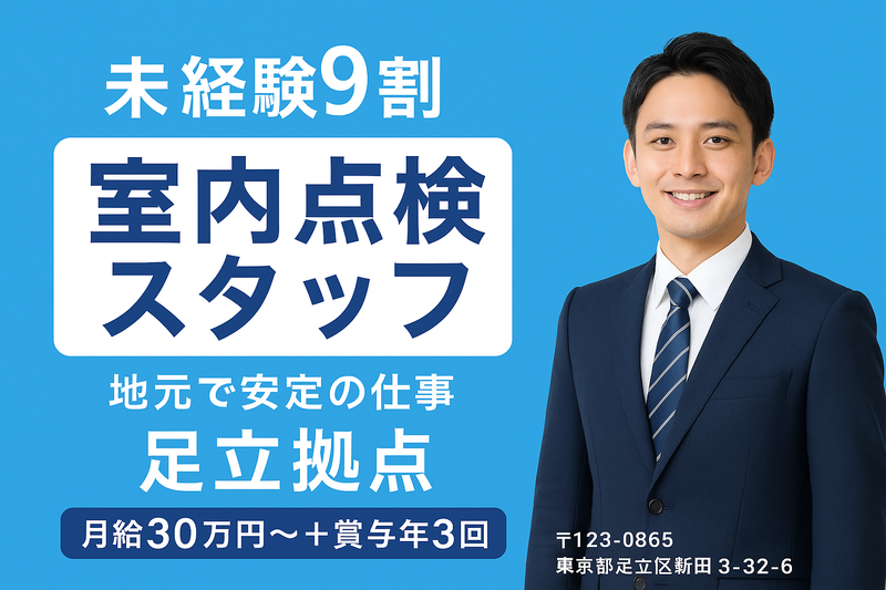 仕事内容 年収500万円以上、完全週休2日制、賞与年3回、未経験から正社員でがんばりませんか? 20〜50代の男性がメインで活躍中! 当社は、賃貸物件の「退去立会い」「室内点検」「原状回復工事の見積り」を行う会社です。 お任せするのは、入居者が退去する際にお部屋の状態をチェックし、修繕や清掃が必要な箇所をまとめる仕事です。 ノルマ・飛び込み営業は一切ありません。 すでに取引のある不動産管理会社からの依頼対応が中心。 「話を聞く」「確認する」「まとめる」が主な業務で、未経験でも安心してスタートできます。 ■ 具体的な仕事内容 ・退去立会(入居者と一緒に室内を確認) ・キッチン・浴室・壁・床などの劣化や傷のチェック ・原状回復工事の見積書作成(社内システム使用) ・職人や清掃チームへの依頼、完了確認 現場は、足立区・北区・板橋区・荒川区・葛飾区・川口市・草加市・八潮市・三郷市・松戸市など、 足立拠点から20km圏内が中心です。 「北千住」「竹ノ塚」「川口」など、都県境エリアの現場も多く、埼玉方面からの通勤者も多数活躍中です。 1日5〜6件ほどを担当。社用車での直行直帰OK! 予定が順調に進めば16時台に退社できることもあります。 ■ 入社後の流れ 入社後は3〜6ヶ月間、研修・同行期間を設けています。 先輩と一緒に現場へ行き、チェックの流れ・報告方法・見積の仕方を丁寧に学びます。 マニュアルも整備されており、段階的にステップアップできる教育体制です。 ■ 給与・待遇 月給30万2千円~+賞与年3回(実績:年間150万円支給例あり) 昇給・賞与あり(成果を正当に評価) 交通費支給 社用車貸与(通勤利用OK・駐車場代全額会社負担) 【年収例】 入社2年目/年収500万円以上(基本給+賞与+各種手当) 社員の9割が年収500万円以上の実績! 頑張りがすぐに評価・昇給へ反映される仕組みがあります。 ■ 休日・休暇 完全週休2日制(シフト制) 有給休暇あり(取得推奨) 長期休暇あり(GW・夏季・年末年始) プライベートを大切にできる環境です。 家族との時間や趣味も両立しやすく、 「安定して長く働きたい」という方に最適な職場です。 ■求める人材 普通自動車免許(AT限定可) 未経験から安定を目指したい方を歓迎! コミュニケーションが苦手でなければOK 現場で動く仕事が好き 誠実な対応を重視したい 家族や自分の時間を大切にしたい 前職は営業・配送・製造・現場作業などさまざま。 30〜50代男性が中心に活躍中です。 ■ 1日の流れ(例) 09:00 自宅から現場へ直行 10:00 退去立会・点検 12:00 昼休憩 13:00 見積・報告業務 16:00 帰社、書類整理 18:00 退社 ■ この仕事の魅力 ・地元勤務・転勤なし ・直行直帰OK/通勤ストレスなし ・未経験9割が活躍中 ・ノルマなし/人と話すのが得意ならOK ・賞与年3回+昇給年2回 「営業」というより“室内点検スタッフ”に近い仕事。 お客様と管理会社の間に立って、誠実に対応できる方を歓迎します。 未経験入社9割!先輩の多くが異業種出身で、 「前職より収入アップできた」「自由度が高い」と好評です。 30〜50代の働き盛り世代が中心の職場です。 ■職場環境の補足説明 未経験9割以上!地元で安定勤務◎ 直行直帰OK・転勤なし・社用車通勤可。 賞与年3回・年収500万円以上も可能。 30〜50代まで幅広く活躍中! 現在活躍中の社員の9割以上が未経験スタート。 前職は配送ドライバー、販売、製造、現場作業員など様々です。 「人と話すのが苦手ではない」「安定した仕事を続けたい」方であれば、経験は一切問いません! 【必須条件】 普通自動車免許(AT限定可) 【活躍中の年齢層】 20代〜50代が男性が中心に活躍中 【歓迎するタイプ】 ・地元で安定して働きたい方 ・人と関わることが好きな方 ・数字よりも誠実な対応を重視したい方 ・自分のペースでコツコツ仕事を進めたい方 ・成果を正当に評価されたい方 ■ 未経験でも安心の理由 ・3〜6ヶ月の研修期間あり ・マニュアル完備で安心スタート ・明確な評価制度で昇給・昇格チャンス多数 ・半年ごとの査定で頑張りが給与に反映 ■ 評価制度 半年ごとの査定で明確な基準に基づき評価。 努力がすぐ給与・賞与に反映される環境です。 9割以上の社員が年収500万円以上を実現! ■勤務地 〒123-0865 東京都足立区新田3-32-6 (東京メトロ南北線 王子神谷駅より徒歩15分) ※社用車通勤可(駐車場会社負担) 選考についての補足説明 応募後1営業日以内にご連絡いたします。 面接は1回・私服OK・オンラインも可。 「まず話だけ聞いてみたい」「見学してから決めたい」も大歓迎! 応募から最短3日で内定可能。 在職中の方も面接・入社日は柔軟に調整します。