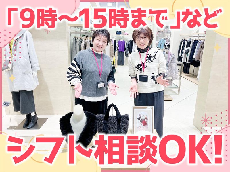職場環境 ・主婦さん活躍中 ・10年以上働いてくれているスタッフもいます ・顧客層は30代・40代・50代・60代の女性メインです 喫煙所:喫煙所あり(屋外)