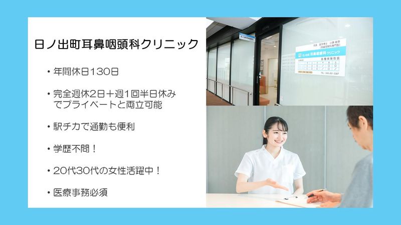 仕事内容 正社員として、 診療のサポートや受付会計など 事務全般をお任せします! \求人のポイント/ ✨有資格者×正社員募集! ✨時給1500円で月収27万円スタート! ✨ネイル可、髪色可、ピアス可 清潔感があればOK! ✨年間休日130日 ✨完全週休2日+週1回半日休み プライベートと両立も可能です ✨駅チカで通勤も便利! ✅仕事内容 ―――――――――――― ・受付会計 患者さまから診察券や保険証をお預かりし、受付対応をお願いします。 また、診療後のお会計や、電話の対応等もお任せします。 ・診療介助 診療器具の受け渡し、患者様の介助を行います。 また、ネブライザー(吸入療法器)等の治療機器の説明もお任せします。 (ご入社時に丁寧にご説明しますので、ご心配なく!!) ・クラーク 患者さまのご案内や、カルテの記入等のドクターの補助業務お任せします。 ・PC入力 カルテに沿って診療内容を入力し、医療費明細の作成をお願いします。 「レセコン」と呼ばれる専用ソフトを使用しています。(PC入力が問題なく対応できれば、すぐに慣れていだだけます!) 上記の業務内容を「日にちごと」「午前・午後のシフト」と分けて担当していただきます。 例えば、午前は受付会計、午後はクラークといったようにお任せします! また、器具の準備や消毒などはスタッフみんなで協力して行います。 是非あなたがお持ちの資格を当社で活かしてください!ブランクOKです!