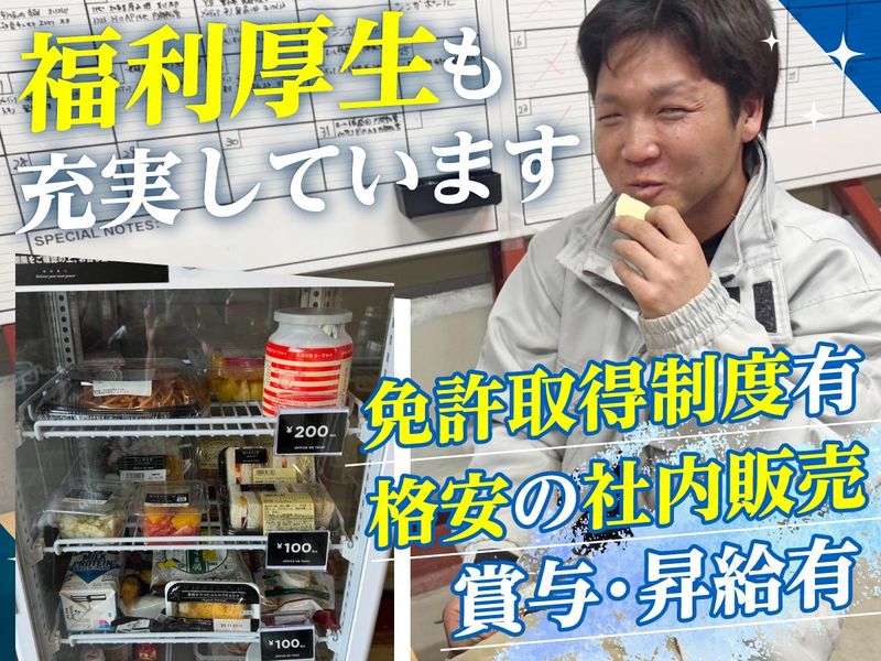 【保険制度】 雇用保険、労災保険、健康保険、厚生年金 待遇・福利厚生 【福利厚生】 ■社会保険完備 ■交通費全額支給(会社規定有)…現場までの交通費は全額支給 ■車通勤可 ■資格取得制度あり(会社規定有) ■自動車免許取得制度あり(会社規定有) ■『OFFICE DE YASAI』導入 …野菜や軽食が100~200円で購入可能! ■はぐくみ企業年金制度 ★社員旅行あり 2025年はシンガポールと沖縄に行きました! もちろん社員の負担はゼロです◎