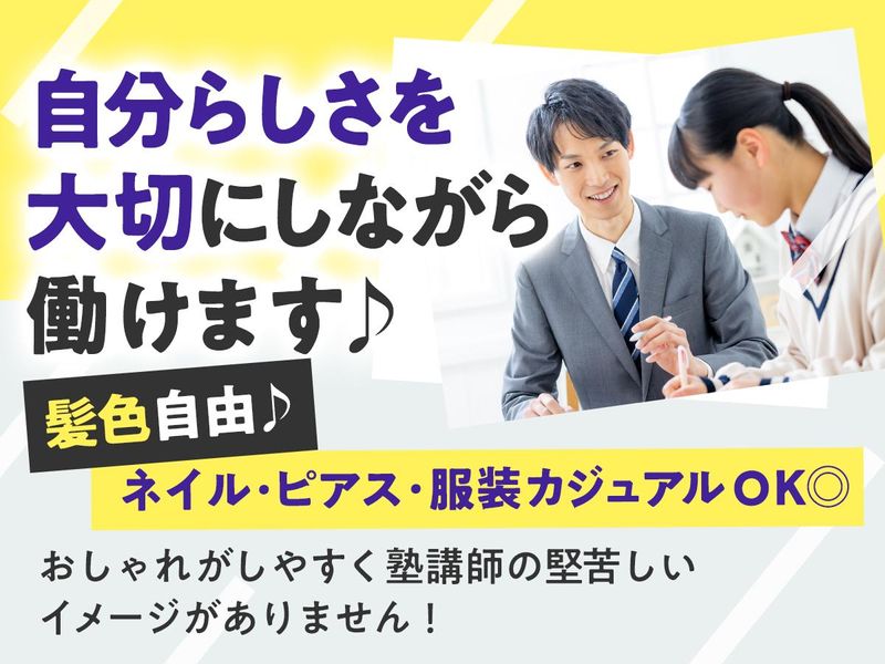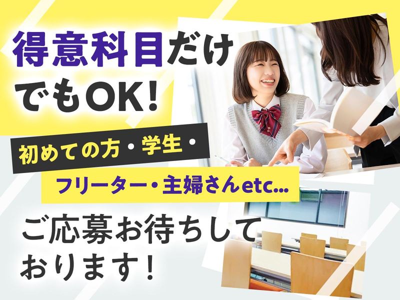 求めている人材 <学歴・経歴は一切問いません◎> ■未経験スタート歓迎! ■ブランクがあっても問題なし◎ ■髪型・髪色自由/ネイルOK♪ ■服装はオフィスカジュアルでOK♪ 【一つでも当てはまる方はオススメ♪】 ■掛け持ちバイトで週1日だけ入りたい方 ■お小遣いをガッツリ稼ぎたい方 ■得意科目を活かして働きたい方 ■大学生・専門学生の方 ■フリーターさん・主婦(夫)さん ■理系科目が得意な方 ■家庭や学業と両立したい方 ■ゆくゆく正社員を目指したい方 etc... ※小・中・高校のいずれか、 得意科目1教科から授業OK! ※受験経験(高校・大学)で得た教養を 活かすことができます◎