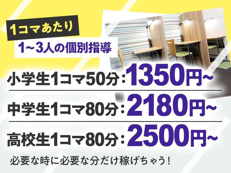 仕事内容 \ CHECK! / ………………………………………… ⏩週1日・1コマから勤務OK! ⏩得意な1教科だけの授業でもOK♪ ⏩個別指導だから教えやすい◎ ⏩研修があるから初めてでも安心♪ ⏩学生・主婦(夫)・Wワーク歓迎! ⏩冬期講習期間はシフト多めも可◎ ………………………………………… :::⭐ 得意科目だけでOK! ⭐::: スキマ時間を活かして働ける 個別指導の塾講師アルバイト! ━━━━━━━━━━━━━━━━ >>>お仕事内容 ━━━━━━━━━━━━━━━━ 小学生〜中学生を中心とした 生徒1〜3名の個別指導をお任せします◎ ▼具体的には… ✅宿題のチェック、丸つけ ✅定期テスト対策のサポート ✅学習の進捗確認 など 担当する科目は、 あなたの「得意科目」だけでOK! ・英語 ・数学 ・国語 ・理科(物理/化学/生物/地学) ・社会(日本史・世界史・地理・政治経済) 教えられる教科からお任せします。 集団授業のように 大勢の前で話す必要はなく、 生徒と向き合いながら進められるため、 初めての方でも始めやすい形式です♪ ━━━━━━━━━━━━━━━━━━ >>>研修があるから初めてでも安心♪ ━━━━━━━━━━━━━━━━━━ 「塾講師は初めてで不安…」 そんな方もご安心ください◎ 授業の進め方や指導のコツは、 事前研修でしっかりレクチャー! 指導マニュアルや教材も整っており、 何を・どの順番で教えるかが 分かりやすく決まっているため、 未経験の方でも安心してスタートできます♪ ━━━━━━━━━━━━ >>>柔軟なシフト制◎ ━━━━━━━━━━━━ ⏩週1日・1コマから勤務OK◎ 週1日・1コマ(50〜80分)から勤務可能! 「稼ぎたいから週5で入る!!」 「平日は学校終わりに1コマだけ♪」 など、あなたの生活に合わせて 無理なくシフトを組めます。 学業・家庭・Wワークとの両立もしやすく、 スキマ時間を有効活用したい方に ピッタリの働き方です◎ ━━━━━━━━━━━━━━━━━ >>>年代問わず始められる環境◎ ━━━━━━━━━━━━━━━━━ 大学生・大学院生はもちろん、 社会人・主婦(夫)など、 幅広い年代の講師が活躍中! 未経験からスタートした講師も多く、 初めての方でも 安心してチャレンジできます◎
