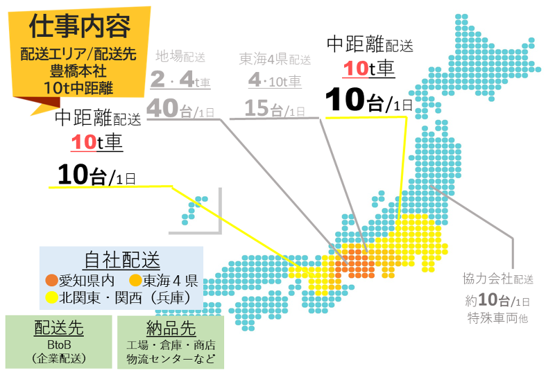 仕事内容 【求人PRポイント】 ◆大型免許取得して間もない方でも応募OK! ◆社内テスト合格で10t車ドライバーへ! ◆仕事の基本は4t車で覚えます。 (給与や仕事は4t、東海4県エリアをご覧ください) ◆未経験の方は4tスタートと 安心のドライバーデビュー ◆20代ドライバーも活躍中のコース ◆週に2~3回の地場配送 ◆月の走行距離6,000キロから8,500キロほど ◆フォークリフトなど資格取得制度あり ◆1人1台専用車(完全禁煙車)をご用意 【 応募方法 】 - ログイン不要 電話でのお問い合わせを 積極的に受け付けています! ログインせずに応募したい方は TEL:0532-31-4610 採用担当、山本か山田まで。 ご質問、お問い合わせのみOKです。 Webからの簡単応募もお問合せもOK (24時間応募可) - 【仕事内容】 中距離(北関東・関西)エリアでの 10tドライバー業務をお任せします。 ※北関東(茨城、埼玉、群馬、千葉) 関西(兵庫) ※東海4県配送も週に2~3日あります。 パーキングエリアなどで車中泊があります。 全線高速道路使用します。 有料代や燃料代の費用は会社負担です。 <配送品目> 工業用原料や飲料関連、 日用品(ベットマットなど)などの配送です。 納品時など手積み手降ろしもありますが、 パレット積みも組み合わせて配車を組んでいます。 <配送場所> 倉庫や物流センター・配送センターなど 会社様への納品です。 未経験の方は4t配送からスタートになります。 早期に社内大型運転テストを行います。 私たちの仕事を内側から見て 体験を必ずしていただきます。 また、様々な形や重さの商品を混載するため、 確かな養生の仕方などが身に付きます。 10t車乗務へステップアップする際の 大きな強みになります。 - 【職場環境】 帰社時に心置きなく話しかけられる、 相談できる雰囲気を大切にしています。 事務所には元ドライバーが多く、 新人教育担当者もいるので、 わからないことがあれば、 新人の方でも聞きやすい環境です! 他業種からの未経験で 入社された方は8割ほどです。 また子育て中の方も多いので支え合っています。 そのため、風通しの良い職場を心がけ、 気を張らなくても相談してもらえるよう、 細やかな交流をめざし、体制を整えています! 未経験でも安心して働ける環境 入社5日間の座学と実践、 各月の研修などを管理部がしっかり行い サポートしていますので安心して始められます。 また、実務では仕事に慣れるまで先輩社員が、 しっかりフォローしていきます。 日々業務を進めていく上で 疑問や分からない事などは配車係にも、 気軽に相談してくださいね! - <最短1分で応募完了> 『電話応募』もしくは、 画面下の『応募画面へ進む』ボタンを押して カンタン応募。 応募〜合否まで、5日ほどです。 \健康経営優良法人認証・ 働きやすい職場認証の会社です/ 皆様のお問合せ、ご応募をお待ちしております! - ◆未経験スタート◆ 教育体制ばっちり! 安心してお仕事していただけます! 10代未経験入社で2tからステップアップして 3年ほどで大型トラック乗務の実績あります。 20代未経験入社で4tからステップアップの方も◎ 働きやすい環境を整えています。 資格取得制度をご用意! 入社1ヶ月で使用可能! σ~σ~σ~σ~σ~σ~σ~σ~σ~σ~σ~σ~σ~σ~σ ✅マイシン チャンネル✅ https://www.youtube.com/watch?v=HTVAfFWpExI ↑「日常点検の仕方」 管理部教育担当者による 新入社員さんへの教育の一端です。 https://youtu.be/8HY82LJL35U 当社でご活躍中の若手ドライバーさんに聞いてみました。 「Z世代ドライバーに50の質問」 ドライバーに興味があるけど、よく分からない、 働き方を知りたい、体を動かして働きたい、 ドライバーとしてステップアップしたい、 など気になる方はぜひ社員のリアルな声をチェック! σ~σ~σ~σ~σ~σ~σ~σ~σ~σ~σ~σ~σ~σ~σ