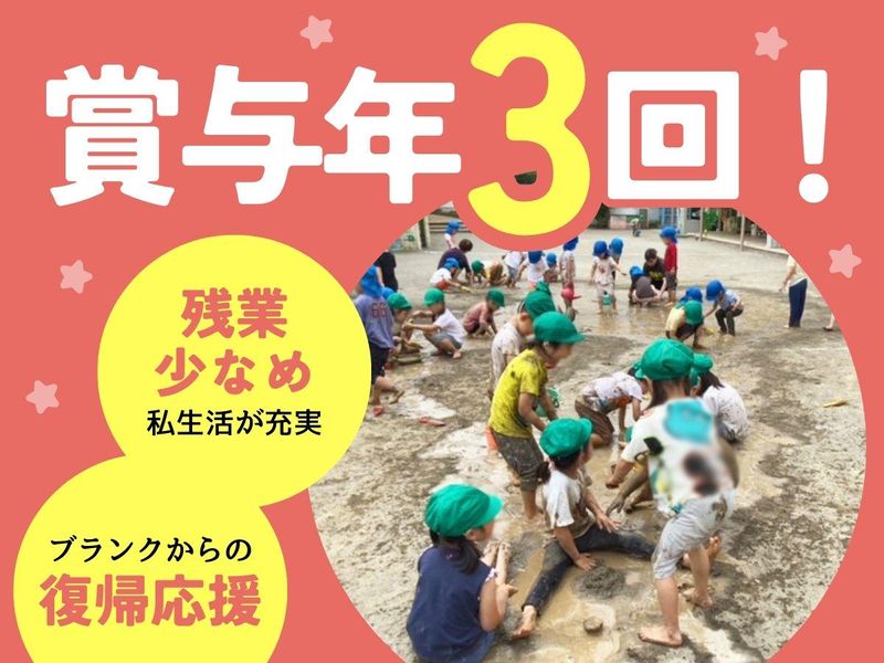 仕事内容 ╭──────────────・★₊⁺─╮ ✨大学卒業以上の方募集!安定の正社員✨ \\資格と経験を活かして働けます❗// 残業ほぼなし▶メリハリをつけて働ける♬ ╰─⁺₊★・──────────────╯ ┏━━━━┓ ┃ポイント┃ ┗━━━━┛ ⭐賞与年3回!年間4.53ヵ月 ⭐残業少なめ!私生活充実◎ ⭐ブランクからの復帰応援♪ ⭐年休初年度15日(最大25日) ※4月1日から付与 ⭐夏季休暇6日 ⭐自宅研修1日 ⭐持ち帰りの仕事なし ⭐残業代しっかり保証します。 【お仕事内容】 子ども1人1人の育ちを大切にする保育を作ります。 子どもと一緒に遊びも生活も楽しみます。 ✅保育業務全般 └お散歩・園庭遊び └給食準備・片付け など ✅行事やイベントの準備・運営 ✅保護者との連絡・相談対応 ✅連絡帳・日誌業務 など ※0歳児~就学前までの園児 定員110名の保育園です◎ (運用定員111名) <⏰1日の流れ(例)> 09:30 子どもたちと朝の集まり 10:00 散歩・遊び・美術 11:30 給食 13:00 休憩 15:00 おやつ 16:00 自由遊び ╒━━━━━━━━━━━━━╗ ✨ 無理なく働ける環境 ✨ ╘━━━━━━━━━━━━━╝ <☘複数担任制度で負担軽減> 幼児クラスも複数担任制なので、 ひとりで悩むことはありません! 研修制度や打ち合わせも充実◎ ベテラン保育士が 多数在籍しているため、 なんでも相談できる環境です。 子どもと一緒に成長できます。 <☘リフレッシュしながら働けます> 休憩時間は、子どもと離れて 60分ゆったり取れます♬ 休憩時間外出可能です。 近くで昼食を購入することも可能です。 年休や夏休みもしっかり保障! 産休・育休制度も充実しているので 安心して働けますよ♪ ✋「メリハリをつけて働きたい」 ✋「プライベートも充実させたい」 …など叶う環境です♪ ✅「保育の仕事は好きだけど、 働く環境に悩んでいる…」 「経験を活かしてステップアップしたい」 そんな方におすすめです✨ ❇。・✧・。❇。・✧・。❇。・✧・。❇。・✧・。❇。・✧・。❇ 【☘クラブ保育園について☘】 20代から50代まで 幅広い年齢層が在籍中! 子育て世代も多数♪ 男性保育士も活躍中! 広いお庭があるので、 子どもたちと鬼ごっこや ドッジボールをして遊べます♬ 子どもたちが野菜を育て収穫 クッキングも楽しみます! ピアノは弾けなくても大丈夫ですよ! ❇。・✧・。❇。・✧・。❇。・✧・。❇。・✧・。❇。・✧・。❇