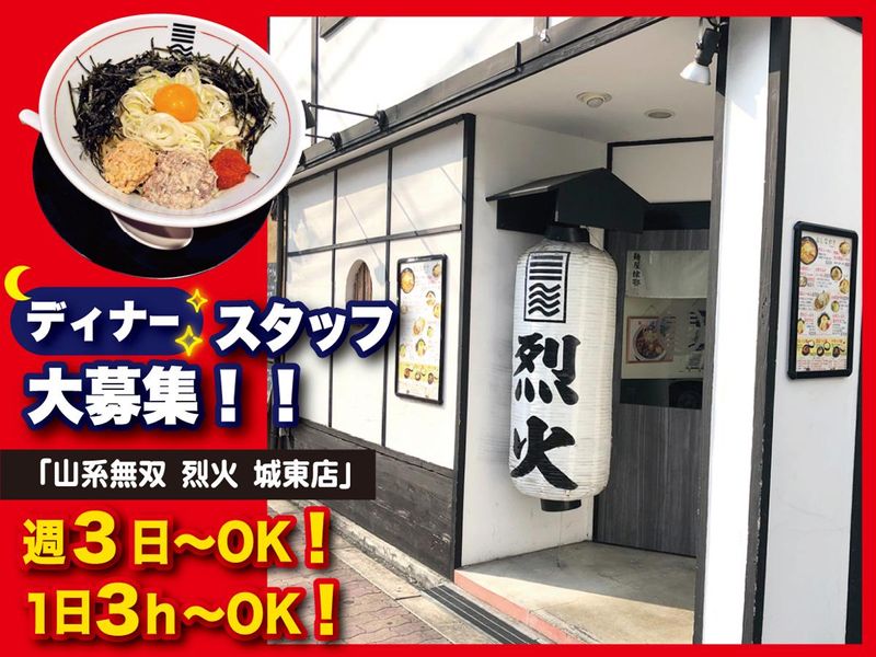 仕事内容 \\おすすめポイント!//  ̄ ̄ ̄ ̄ ̄ ̄ ̄ ̄ ̄ ̄ ̄ ̄ ̄ ⭐ 8年連続百名店選出✨のラーメン店【山系無双 烈火】 ⭐ 学生さん活躍中!学生初バイトにもぴったり! ⭐ 18時以降のディナー勤務は昼間に比べて快適! ⭐ 1日3h〜・週3日〜OK!Wワークや副業との両立も◎ ⭐ 22時以降は時給25%UP! 頑張りはしっかり収入に! ⭐ 従業員価格のまかないあり!お腹も財布も大満足♪ 【主な仕事内容】 ディナータイムのホール接客と簡単な調理補助をお願いします! まずはできることから、あなたのペースでスタート♪ ■■ 接客 ■■ ‐ お客様から食券をお預かりして、オーダーを通します ‐ できたラーメンを配膳、食べ終えたら下膳・片付け <食券制なのでレジ会計はなし!> ■■ 調理 ■■ ‐ 麺の茹で上げなど簡単な調理 ‐ トッピングなどの盛り付け <セントラルキッチンから毎朝食材が届くので、難しい調理はありません> ■■ 研修 ■■ まずは全13種類のラーメンメニューを覚えるところからスタート! そのあとはトッピングや調理などを少しずつ覚えていってくださいね♪ ⭐こんなお店です!!  ̄Ⅴ ̄ ̄ ̄ ̄ ̄ ̄ ̄ ̄ ”ラーメン大国” 山形県の「山形ラーメン」「蕎麦」「食材」にこだわり、美味しいラーメンをご提供すべく日々精進しています。 大人気の山形ラーメン【山系無双 烈火(れっか)】が多くのお客様に愛されています。 ここまで支えてくださった皆さんへの感謝の気持ちを忘れず、「人に優しく、愛情をもち、社会に貢献できるように」の理念を大切に店舗づくりをしています。 \ご応募をお待ちしています✨/