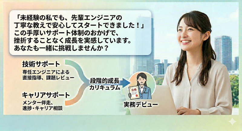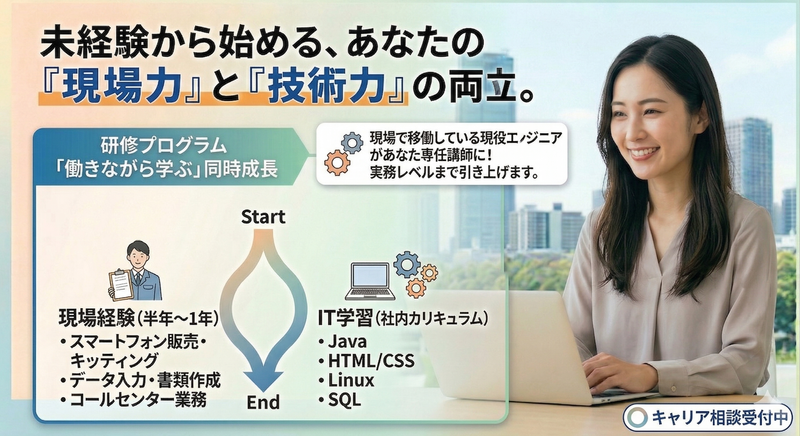 アピールポイント: 「未経験から“続けられる理由”がここにあります」 ・現場経験とIT学習を同時に進める育成モデル ・段階的なカリキュラムで無理なく成長 → 「時間がなくて挫折する」を防ぎます ■専任エンジニア講師 × メンターのダブルサポート ・現場で活躍するエンジニアがあなた専任で指導 ・キャリアを一緒に考えるメンターが伴走 → 技術面もキャリア面も安心して相談できる環境 ■幅広いキャリア選択が可能 ・Web開発(Java / PHP / JavaScript) ・業務システム(C# など) ・データ領域(Python) ・インフラ(Linux / Docker) ・QAエンジニア(テスト) → 自分に合ったキャリアを選べる ■将来の働き方・収入アップが目指せる ・将来的にリモートワーク可能 ・スキルに応じて年収UP!! → スキルを身につければ働き方が変わる