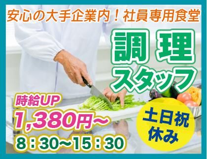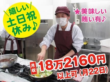 時給1,380円以上 給与詳細 基本給:時給 1380円 〜 ◆交通費支給(上限/月2万円) ◆完全週休2日制 【給与例】 給与例 時給UP1380円!! 【月収】 18万2160円以上可 (時給1380円×1日6h×月~金・週5日/月22日稼働例) ◎ゆとりの8:30~15:30/実6h!退勤時間も早いので身体への負担も少なく長期安定収入可! ◎家庭とお仕事ラクラク両立♪主婦・女性調理スタッフさんも大勢活躍しています♪