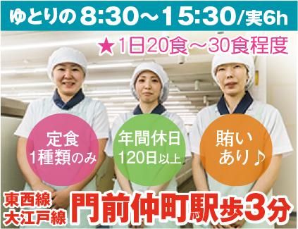 仕事内容 \働く方々に楽しい食事を/ 安心の大手企業内!社員専用食堂♪ 【勤務地】駅近♪通勤楽々! 各 線▶門前仲町駅歩3分♪ (江東区永代2丁目) ◎社員食堂の調理スタッフさん! (調理経験等も活かせます) <ここもポイント♪> ◆1日20~30食程度の昼食調理♪ ☆☆定食1種類のみ☆☆ ◆ゆとり勤務で安定収入! (月収/18万2160円以上可) 【具体的には】 ・献立表に沿った昼食の調理 (日替わり定食1種類) ・仕込み、盛付け、提供 ・簡単な事務など 【勤務時間・曜日】 8:30~15:30/休1h・実6h ★月~金曜/週5日(祝休み) 【休日・休暇】 完全週休2日制(土・日・祝) GW・年末年始・他企業カレンダー ★年間休日120日以上でオフも充実♪ (お子様のいらっしゃる方にも大好評) 【社員食堂で働くメリット】 ✅働き易く安定した勤務時間♪ 社員食堂は企業の営業時間等に合わせて運営されており、中でも平日のランチタイムが中心です♪ ✅お客様は常連(社員やスタッフさん等) 社員食堂のお客様はその企業で働く社員やスタッフさんがほとんどなので、とてもアットホームな環境です♪笑顔いっぱいの「美味しかったよ~」「ごちそうさま」も大きなやりがいです♪ ✅嬉しい食事補助(美味しい賄い)♪ 昼食代節約&お弁当の手間も不要♪ ✅ご家庭での調理にも役立つスキル 調理方法や衛生管理の知識もゲット! ✅他、飲食業等とは異なる休日♪ 各企業等の休日と合わせる社員食堂がほとんどなので、土・日・祝日やGW・年末年始休暇もあるのも人気の理由です。 【当社概要】 ・企業事業所給食/首都圏約200店舗! ・ISO14001取得
